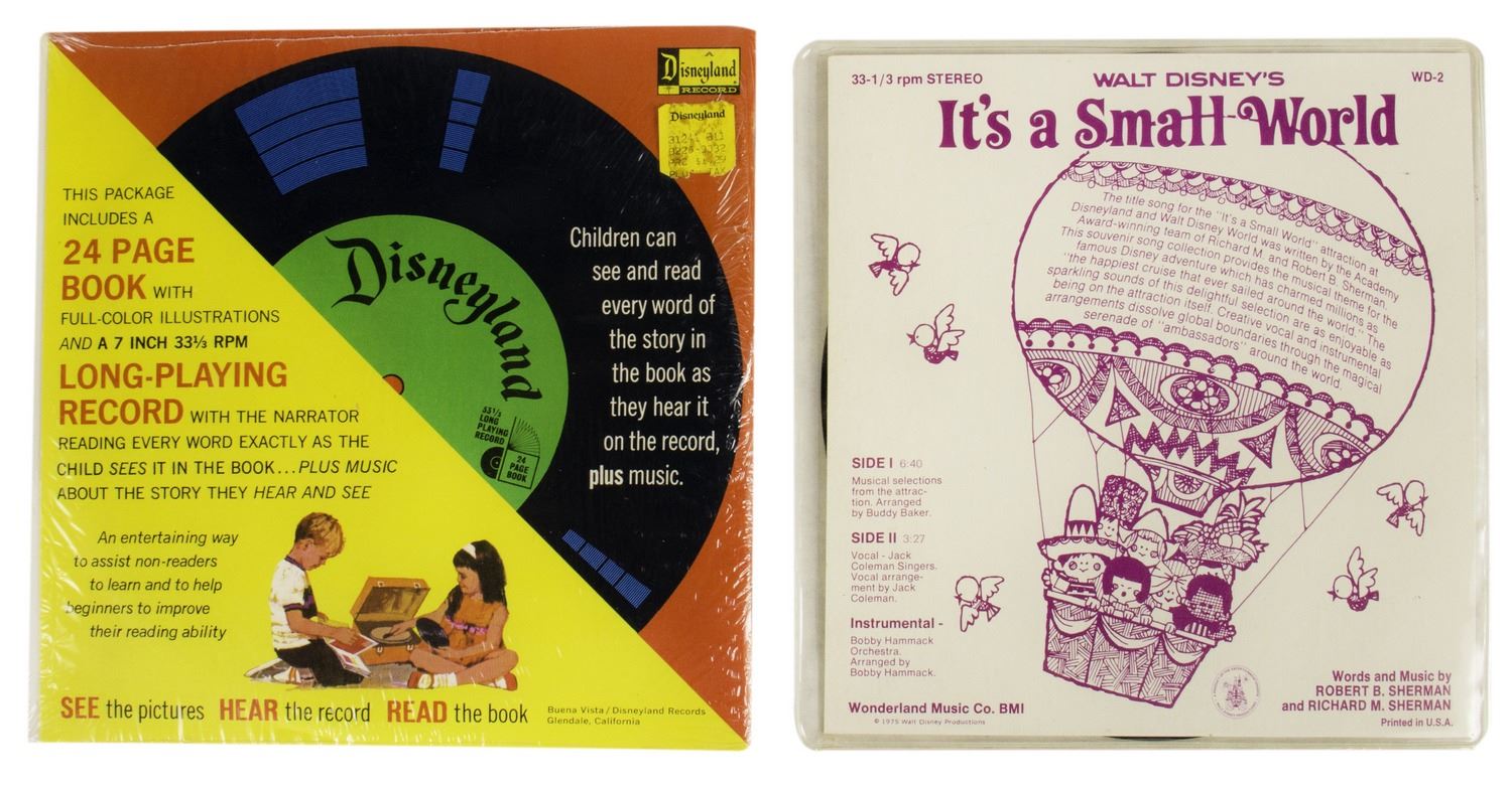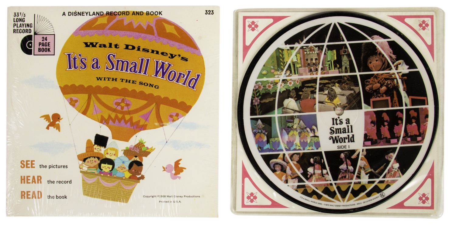 (Disneyland, 1968/75) A pair of records featuring music from the "It's a Small World" attraction at Disneyland. One record is unopened and includes a 24-page book. These items measure 7.25"x7.25" and are in very good condition.