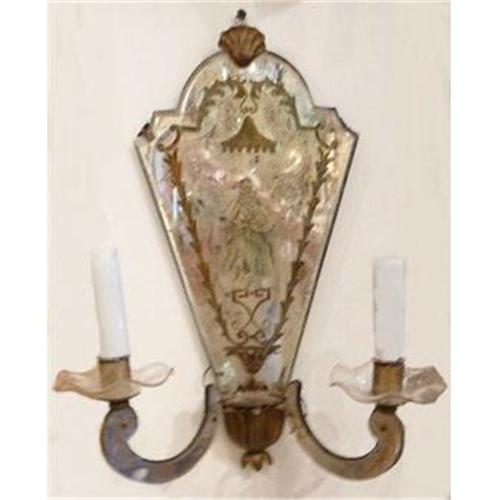This is an exquisite pair of male and female reverse painted Italian Sconces having two mirrored candlestick arms each holding scalloped glass bobeches. They are wired to USA code and make a stunning wall accessory...just beautiful!!!