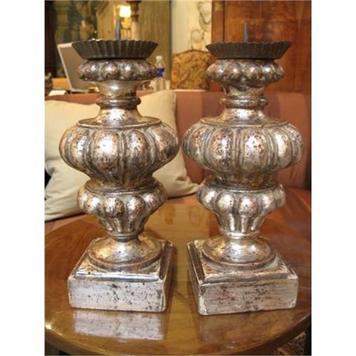 A pair of Italian hand carved and silver leafed torchieres. They would be stunning on a mantel.