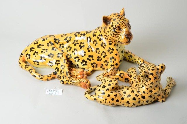 Pair of Italian-made porcelain spotted tigers marked on the bottom “Made in Italy for Meiselman Imports” ; one is a mother cat approx. 36” long and 17” in height with the other a baby approx. 24” long and 10” inheight, both with some damage and repairs; from the Robert Petersen estate and for years were displayed in the Petersen ranch house. Est.: $200-$400.
