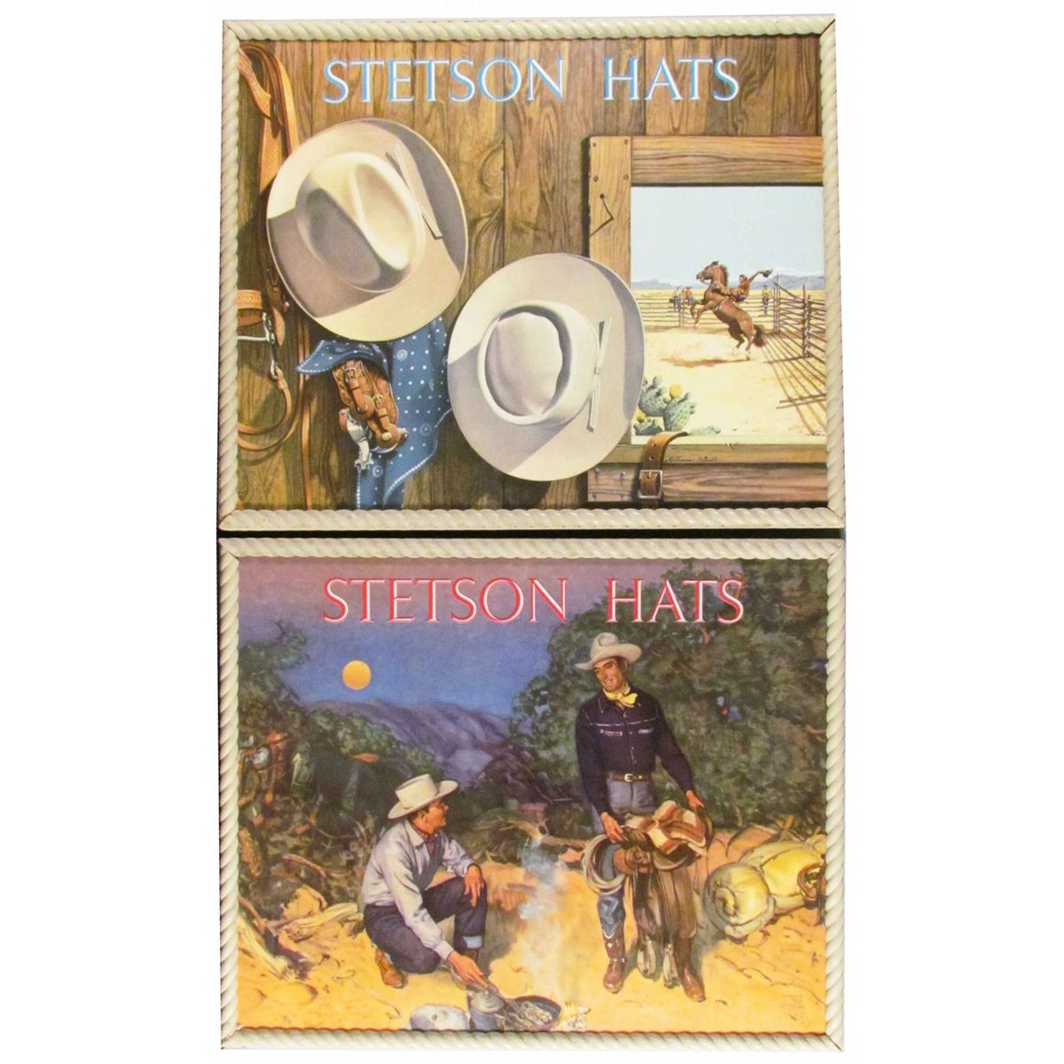 Pair of J.B. Stetson Co. Masonite Signs. One depicting view from the bunk house with let-r-buck in back ground, the other depicts two cowboys on the trail. Both in excellent condition. 16 3/4 X 14 inches.