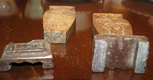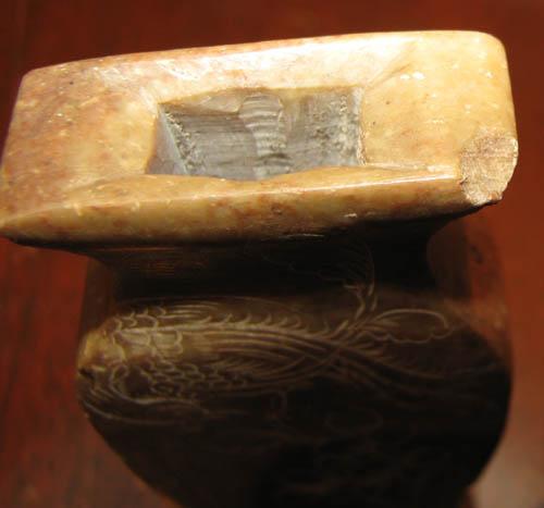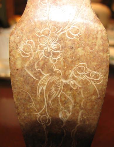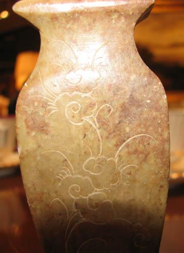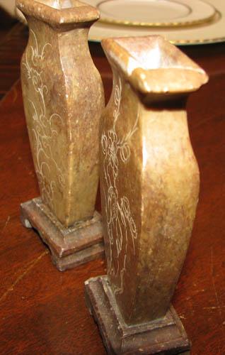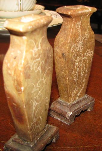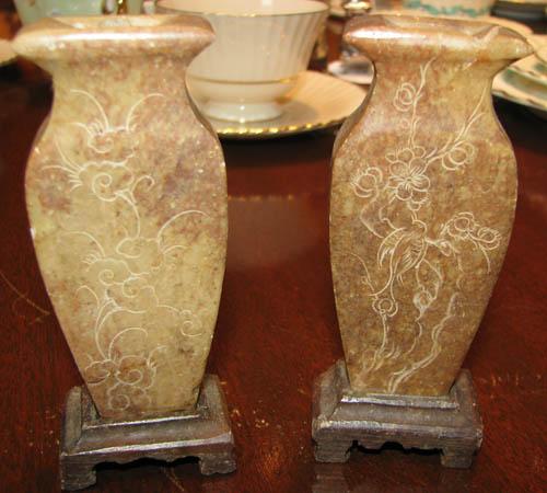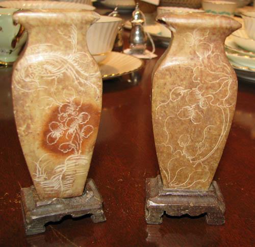 Title: Pair of Jade or Stone Carved and Incised Bud Vases on wood stands