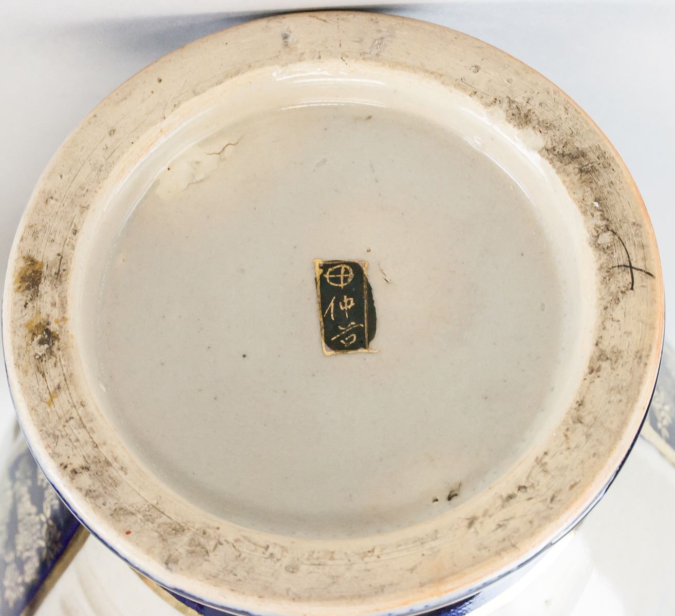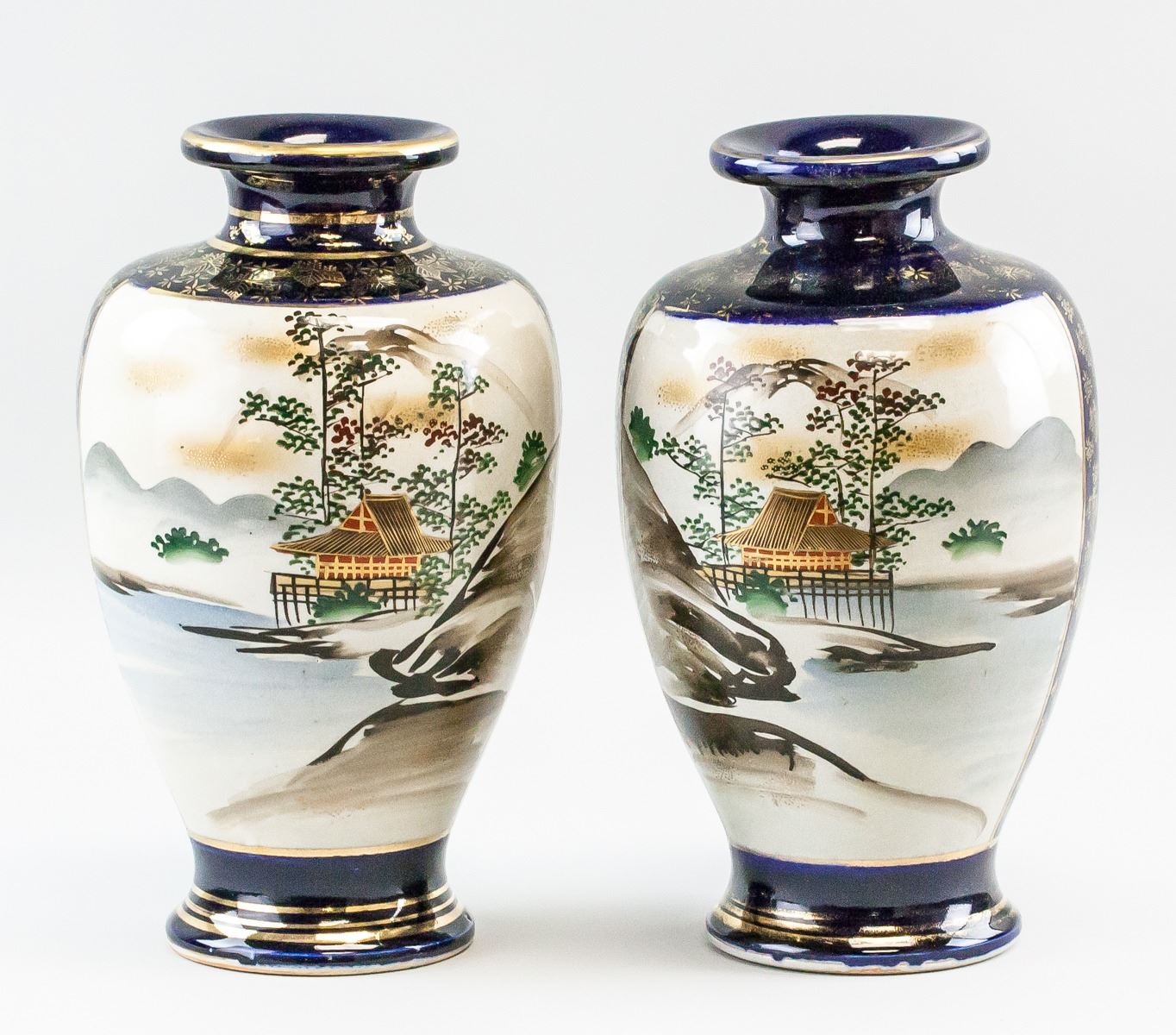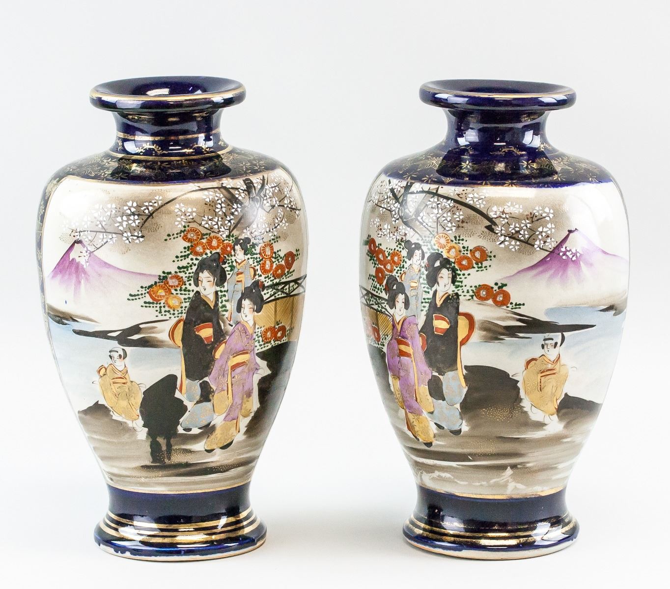 Pair of Japanese cobalt blue earthenware vases. Of ovoid body form featuring scenes of geisha, cherry blossoms and Mt. Fuji with a pagoda on the back. Slight wear on gold gilt in some parts but in otherwise good condition. Marked on base with maker's mark, Nakaya. Early 20th century, circa 1920. 31 x 17 cm, 1668 grams, 1809 grams. Provenance: Acquired from private British estate