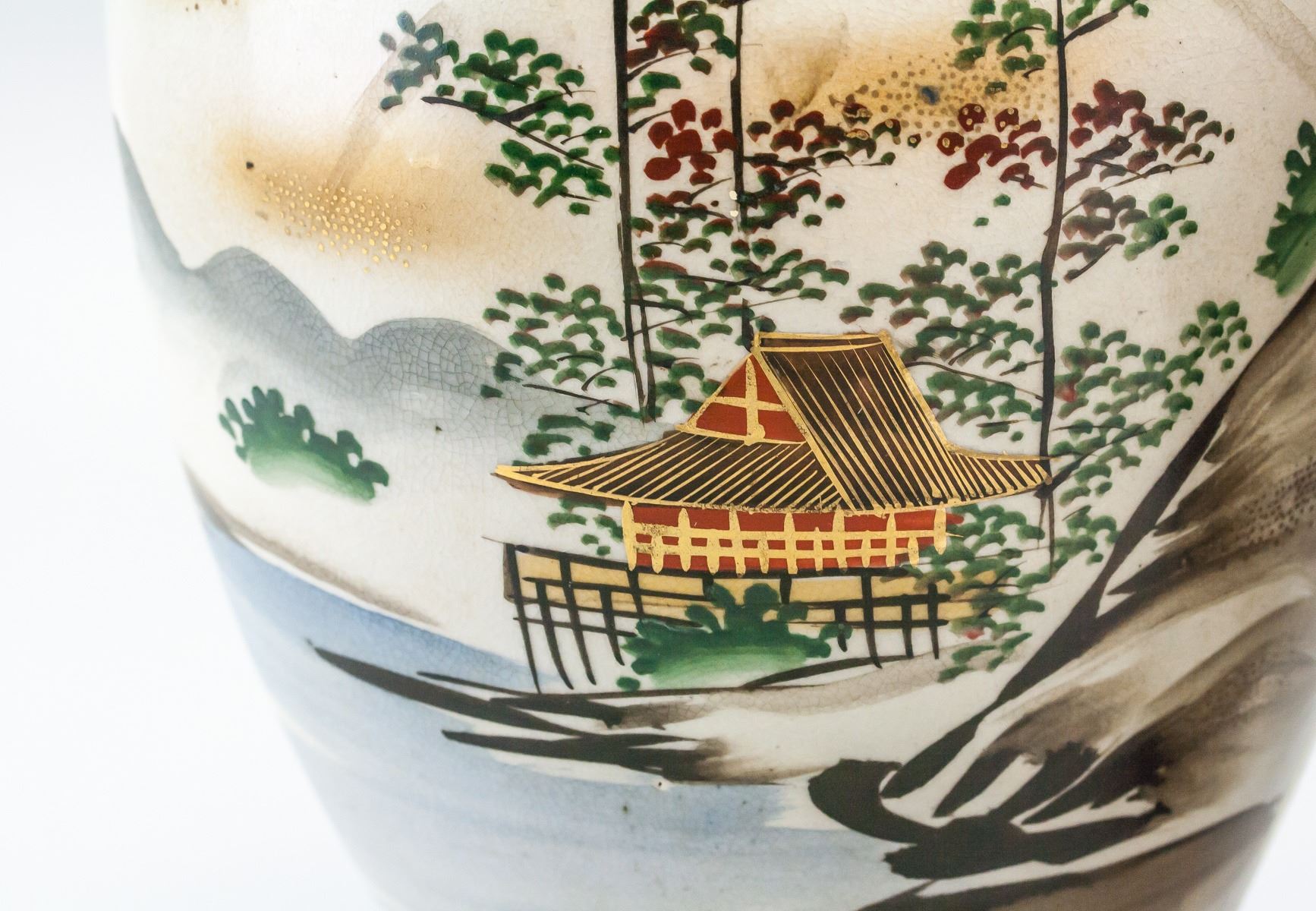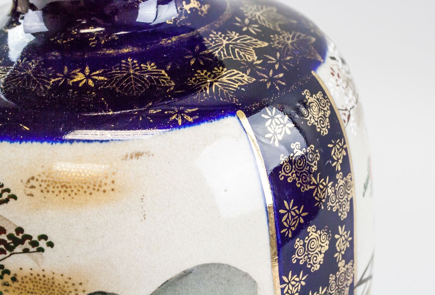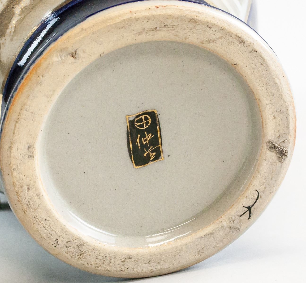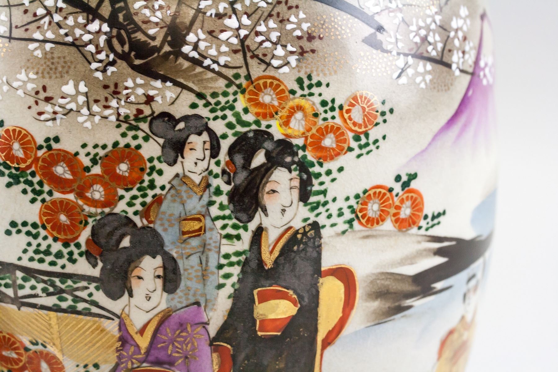 Pair of Japanese cobalt blue earthenware vases. Of ovoid body form featuring scenes of geisha, cherry blossoms and Mt. Fuji with a pagoda on the back. Slight wear on gold gilt in some parts but in otherwise good condition. Marked on base with maker's mark, Nakaya. Early 20th century, circa 1920. 31 x 17 cm, 1668 grams, 1809 grams. Provenance: Acquired from private British estate