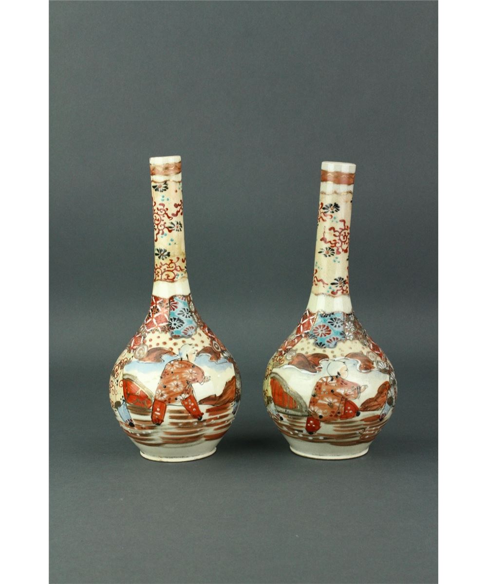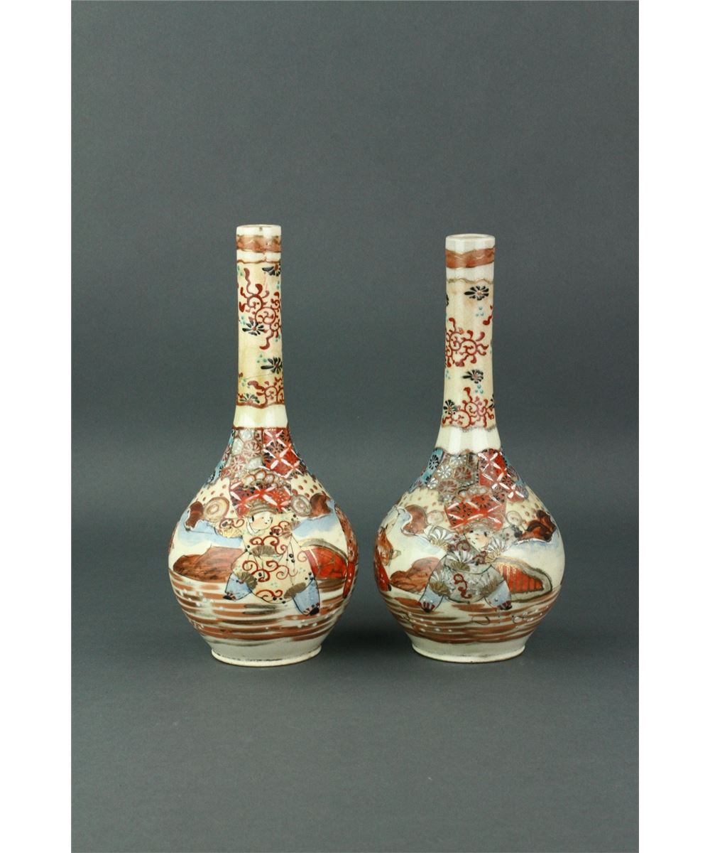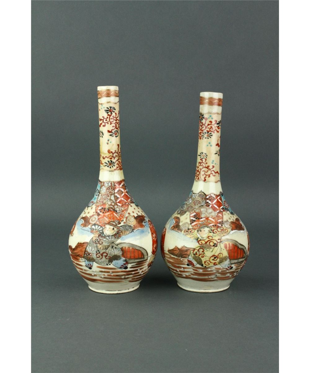 Pair of Japanese painted porcelain vases; of globular body with slender neck; featuring figures in kimono; H: 24 cm, D: 11 cm, 947 grams total