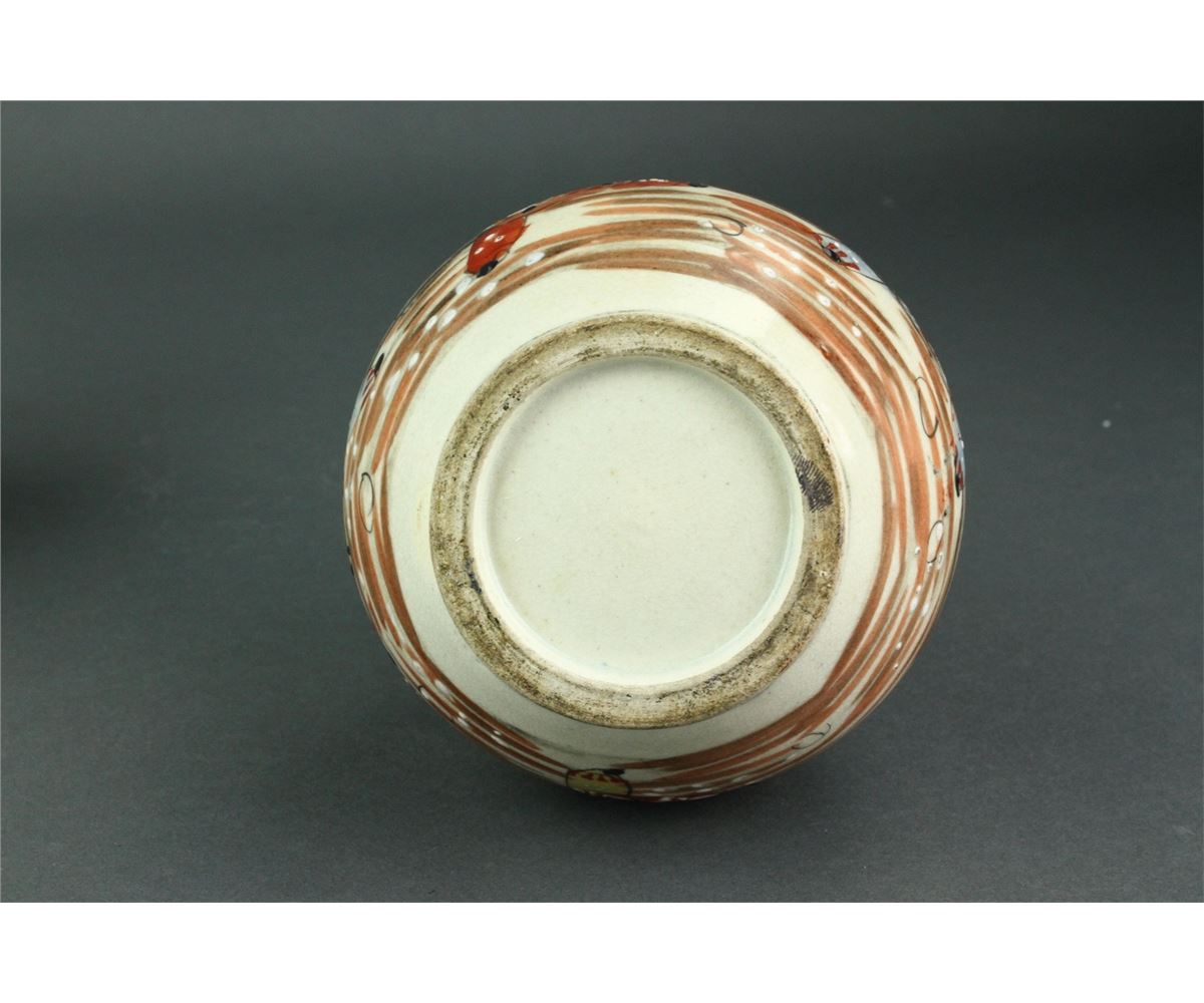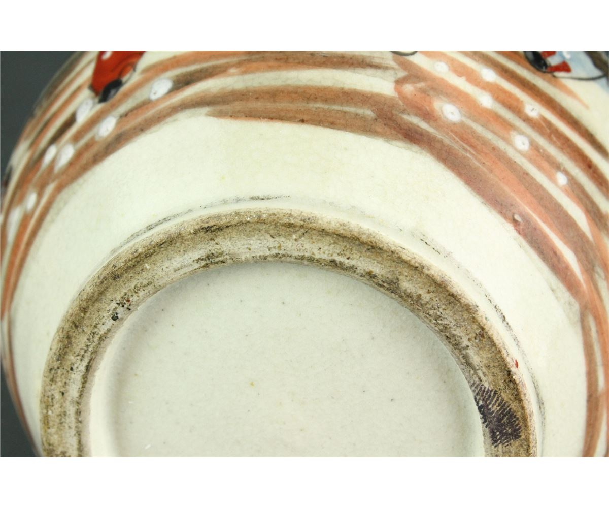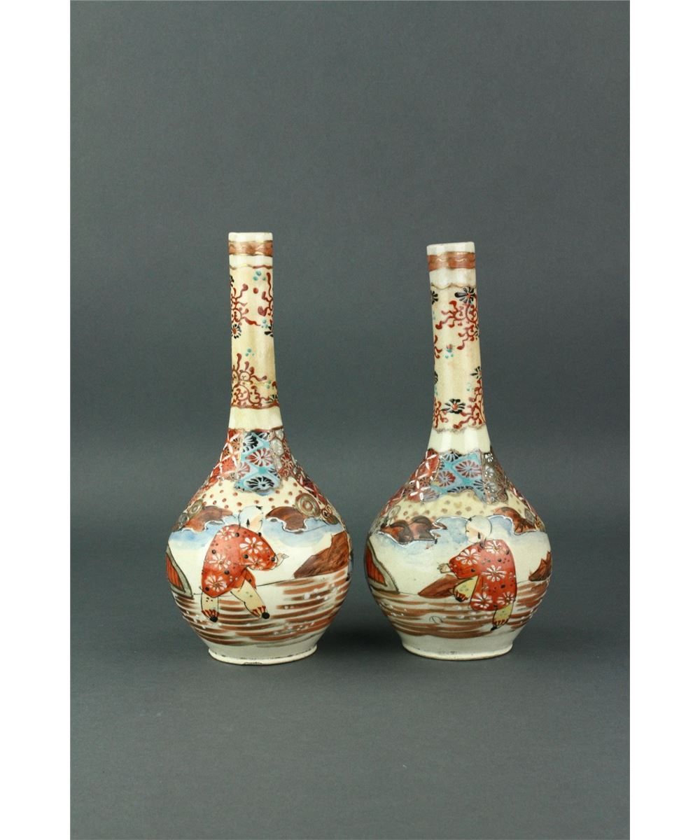 Pair of Japanese painted porcelain vases; of globular body with slender neck; featuring figures in kimono; H: 24 cm, D: 11 cm, 947 grams total
