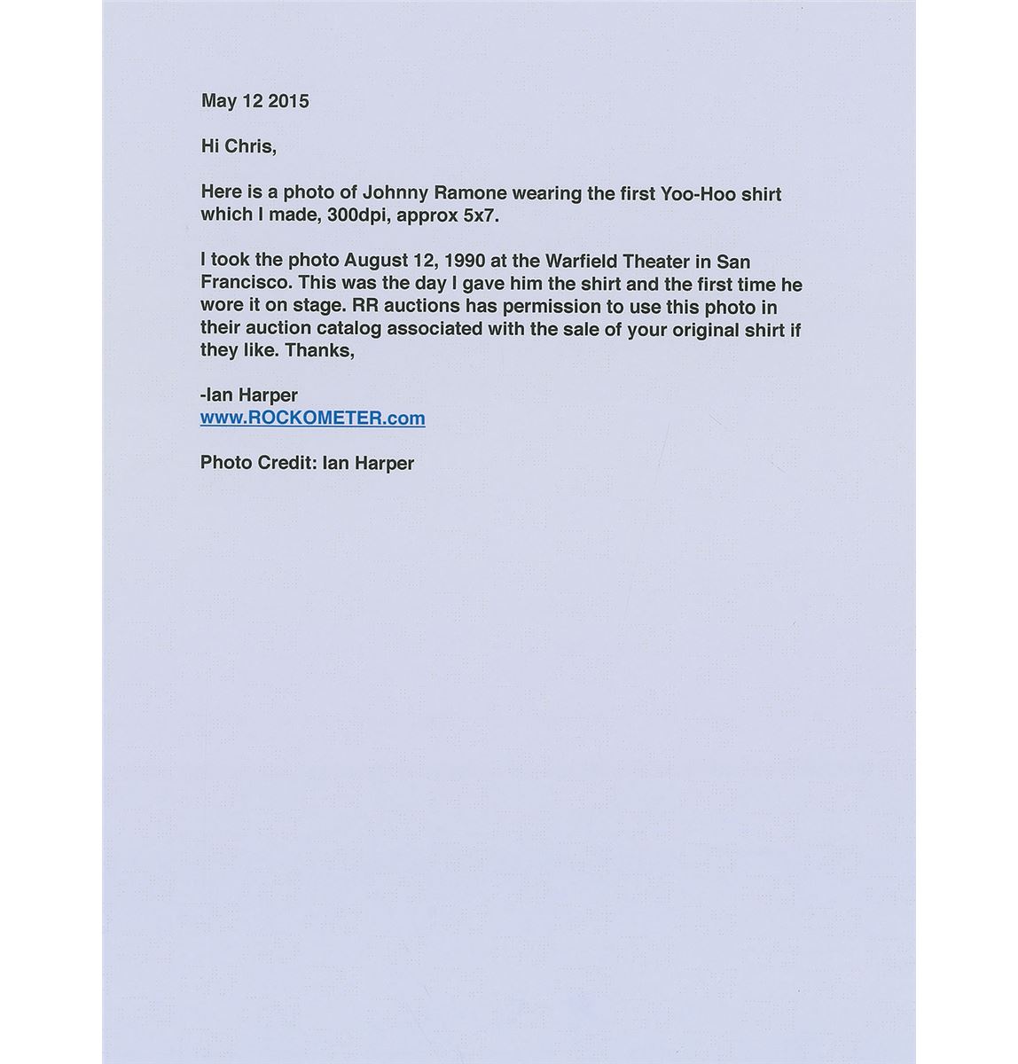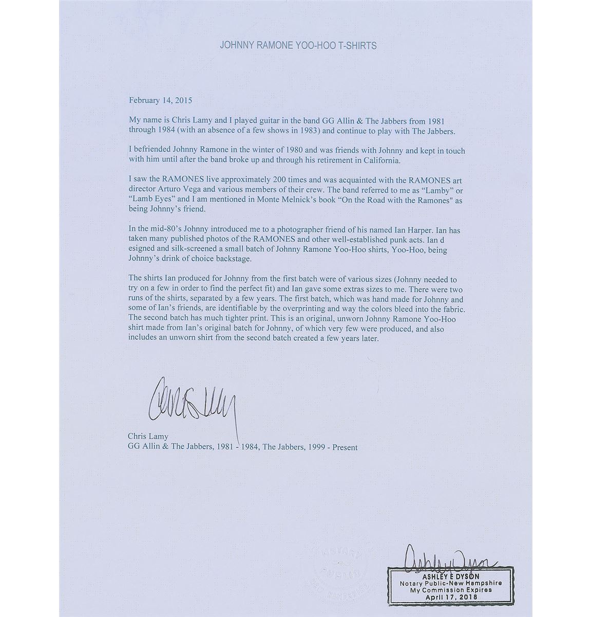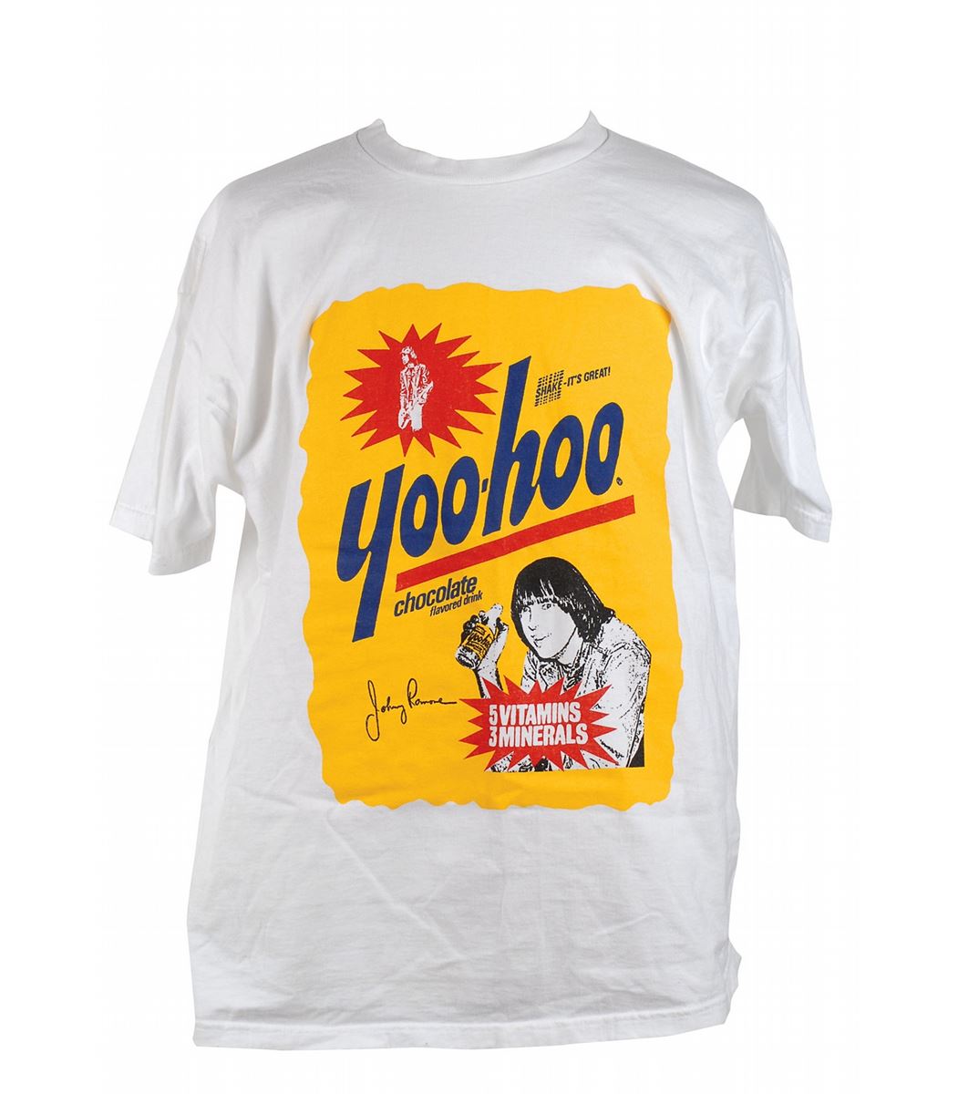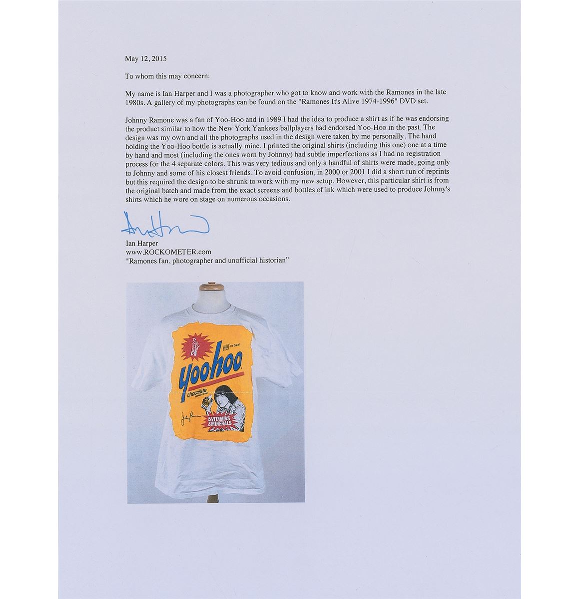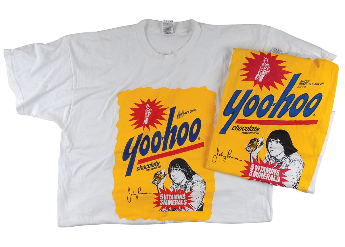 Pair of unsigned and unworn white short-sleeve XXL t-shirts featuring the Yoo-hoo label and an image of Johnny Ramone unofficially endorsing the chocolate flavored drink. In overall fine condition. Ramones photographer Ian Harper hand-screened a very limited number of these shirts in 1990 and then again a decade later on the request of Johnny Ramone, who has been quoted as saying, ‘I always thought of it as my favorite shirt.’ Featuring examples from both production runs (one an original 1990 and the other a 2000 reprint), these shirts were never available as merchandise or for the general public. Included is a letter of provenance from noted Ramones photographer and gear expert Ian Harper, and a copy of an Ian Harper photo of Johnny wearing a similar shirt onstage. Also accompanied by a letter of provenance from Chris Lamy, close friend of The Ramones and guitarist of The Jabbers, formerly GG Allin & The Jabbers. The Chris Lamy Collection.