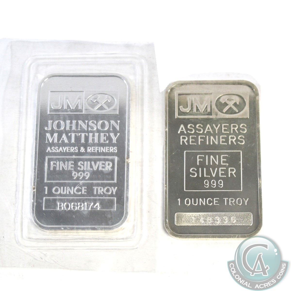 Pair of Johnson Matthey 1oz 999 Fine Silver Bars (TAX Exempt). Receive 1oz example first produced in 1979 with Serial #148336 (blank back) & Recent production sealed with serial #B068174. 2pcs