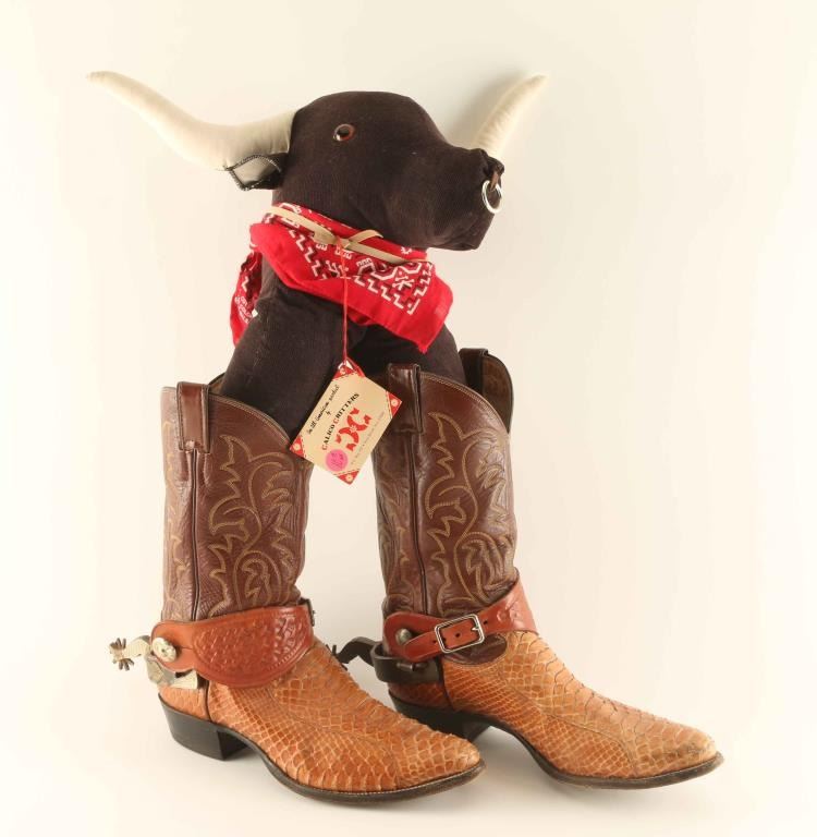Butterscotch snakeskin lowers with reddish brown smooth leather stitched shaft. Size 13B with a pair of gal leg small rowel spurs marked 'ZIA 22'. Comes with a Calico Critters Boot Buddy in the form of a Longhorn steer. Boots show a little wear on toes and soles otherwise good