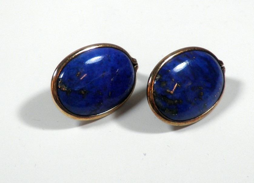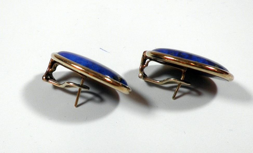 Pair of K14 gold earrings with oval lapis lasuli settings, total weight: 11.5 gm, dimensions: 2x2.5 cm.