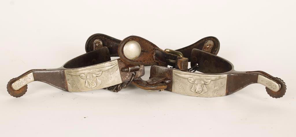 Single mounted steer heads, original rowels, made in El Paso Texas, in fair condition.