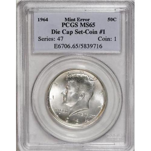 <B>Pair of Kennedy Half Dollar Errors Struck With Die Cap on Obverse Die.</B></I> The two-piece set includes: <B>1964 Kennedy Half Dollar--Die Cap Obverse--MS65 PCGS</B></I>, reverse effectively obliterated, obverse showing prominent flange approximately three times as thick as a normal coin, minimally toned and interesting; and an <B>Undated Kennedy Half Dollar Uniface Reverse MS66 PCGS</B></I>, struck from the same dies with the obverse die cap in place, excellent reverse definition from extra metal with ghostly impression of Kennedy's head on the other side.<BR><BR><B>Coin Engraver:</B> Gilroy Roberts and Frank Gasparro<BR><BR><b>Shipping:</b> Coins & Currency (<a target="_blank" href="http://www.heritageauctions.com/common/shipping.php">view shipping information</a>)