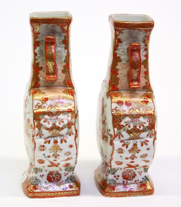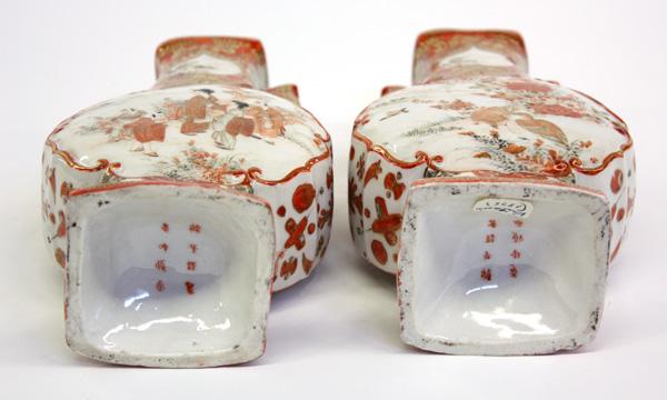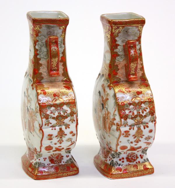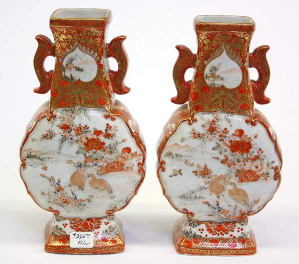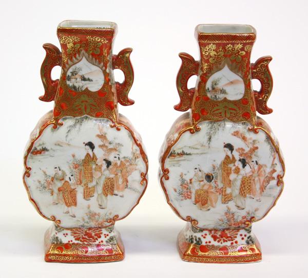 Pair of Japanese Kutani kinrande-style porcelain vases, Meiji period, each body of flattened ovoid shape decorated in gilt and shades of red enamel with birds-and-flowers, reversed by a reserve of women and childen in a landscape, the lobed sides with a jeweled garland and scattered with auspicious emblems, the neck with a pair of handles bracketing heart-shaped landscapes reserved on a foliate-patterned kinrande ground, the base with a six-character studio mark, 7.5''h