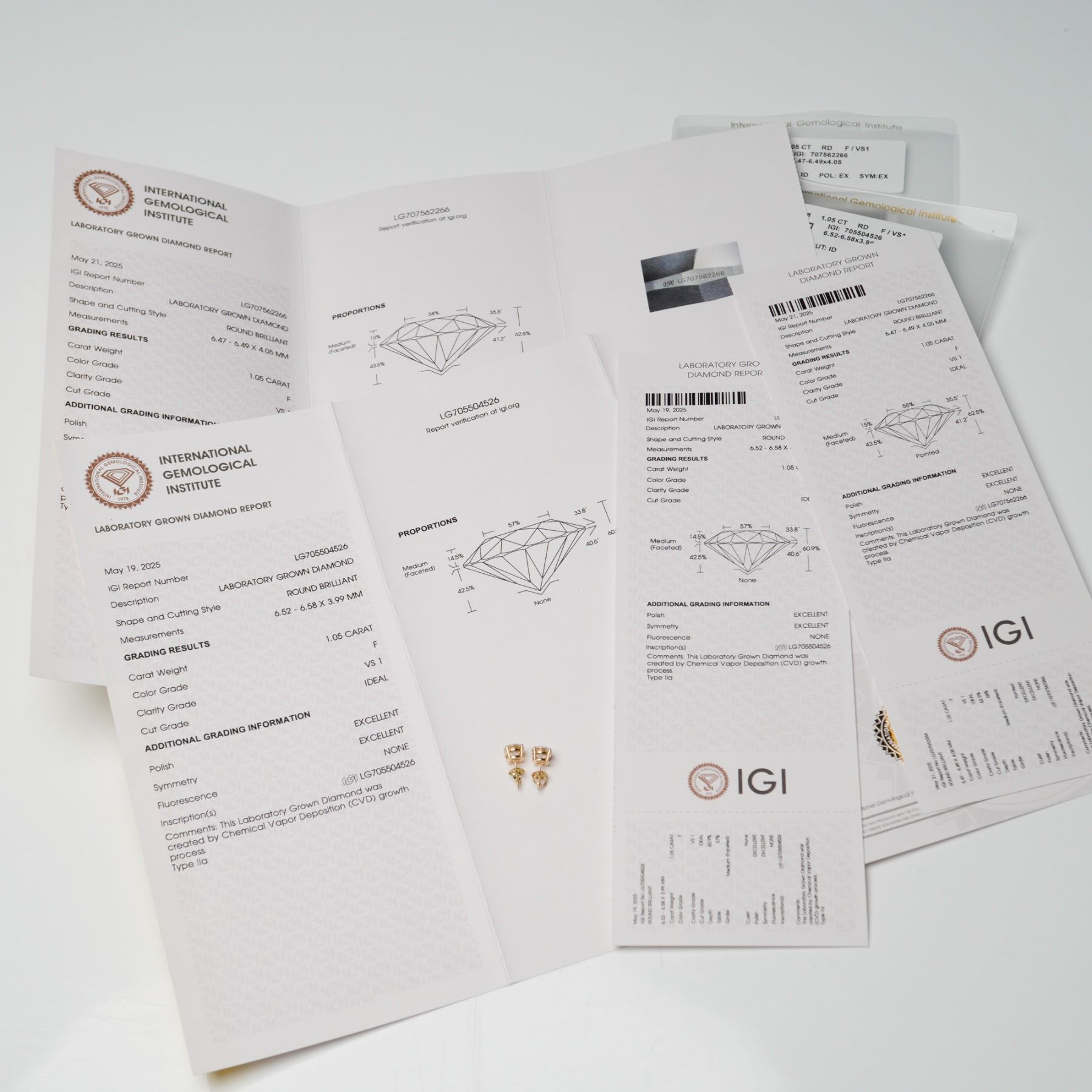 A pair of 14K yellow gold stud earrings, each set with a laboratory-grown round brilliant-cut diamond weighing 1.05 carats, for a total combined weight of 2.10 carats. The diamonds are graded F color and VS1 clarity, with Ideal cut, Excellent polish, and Excellent symmetry. Each earring is accompanied by its own IGI report (IGI LG705504526 and IGI LG707562266), which confirms the diamond's grade and Type IIa status, created via the Chemical Vapor Deposition (CVD) growth method. The earrings feature secure screw-back posts and butterfly backs, each marked "14K" on the interior of the backing.