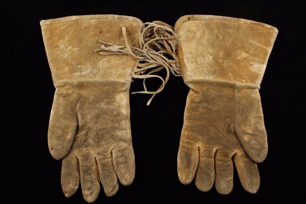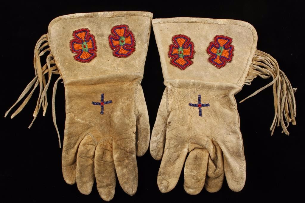 Leather Gauntlets with 3 beaded crosses in primary colors with fringe. In overall good condition.