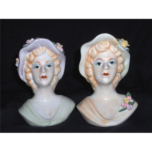 Here are 2 Lady Head Vases being sold together. There are 4 in the original set. They are fairly new, as compared to the vintage 40's and 50's. The faces are pretty much the same, their attire also except the arrangement of the flowers and colors. Condition is excellent on both pieces. No damage of any kind. A nice addition to any collection. See photos. Take a look at my other items. Thank you for viewing.