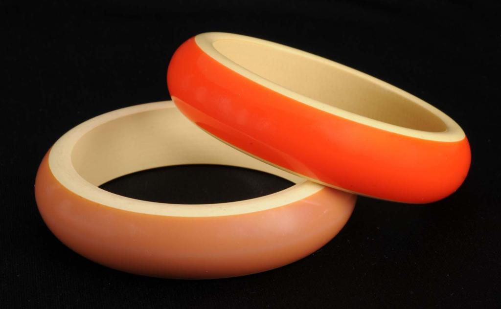 Description One bracelet is orange and the other is tan. Condition (Excellent). Size 2 - 3/4".