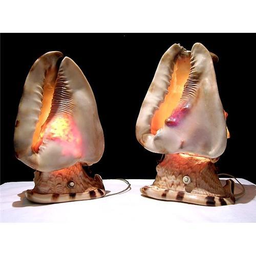 Pair Lamps made with Snails. Made many years ago. Are hold with screw, where you connect a lamp inside of them. All the electrical is wll adapted and working. Is beautiful to see only the lights of them in the dark. Has an important size. One of them is wasted with only a detail as you can see in the picture. They are not cracked.