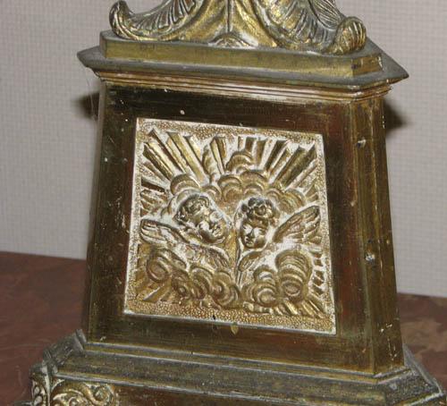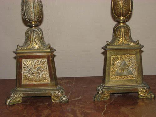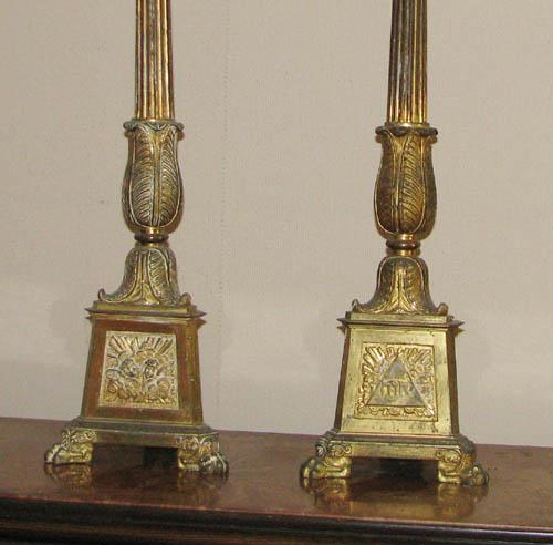 Title: Pair of Large Brass Candlesticks with Hebrew inscription and cherub decoration, tripod bases