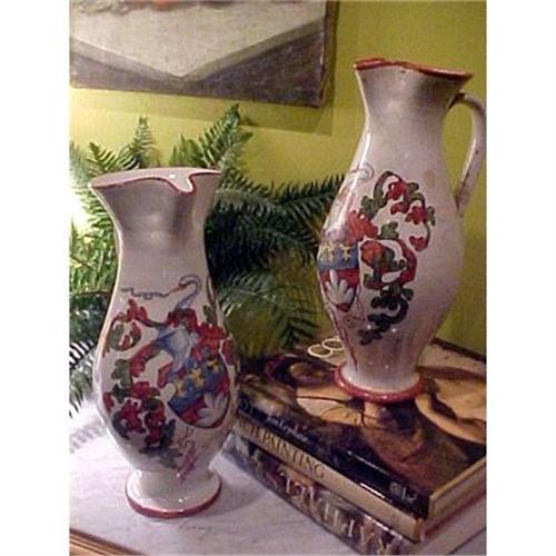 These are wonderful, large jugs with great rustic appeal. Each ewer is approximately 16.5" high with an applied handle. The armorial design is in vivid colors on a white (more or less) ground. The handle has a red painted leaf design, the spout is trimmed in red. One of the ewers has been professionally repaired. You cannot tell at all that has been repaired, except that it is the clean one. The other ewer is in excellent condition. I was told that these were 19th century. I will say they date to the turn of the century till about 1920. These are fabulous!