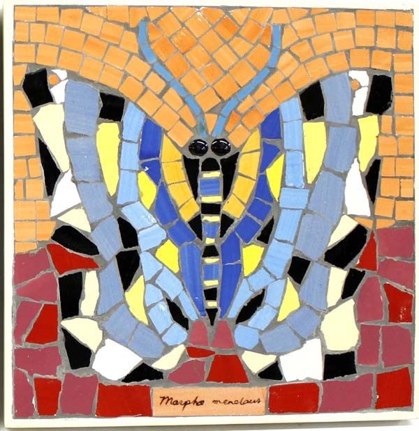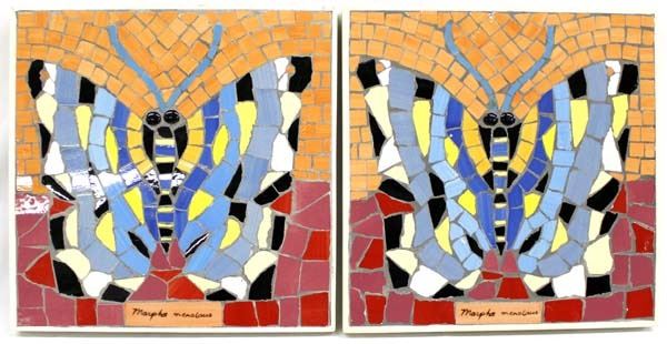 Pair of Large Framed Mosaic Tile Butterfly Pictures, measures 13''square