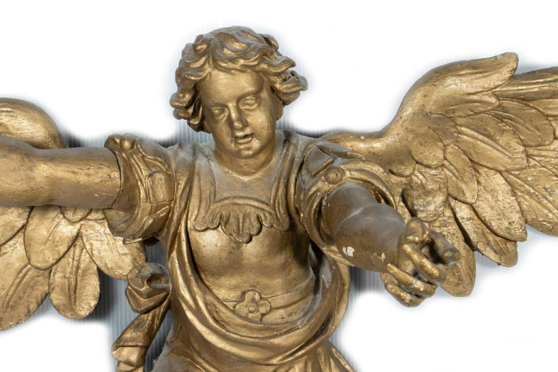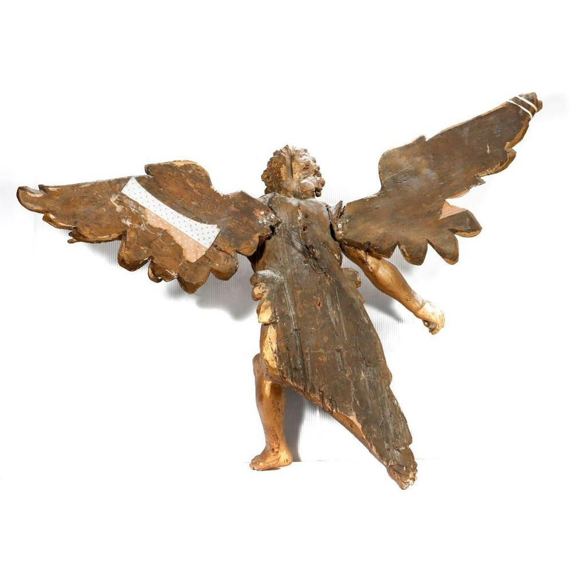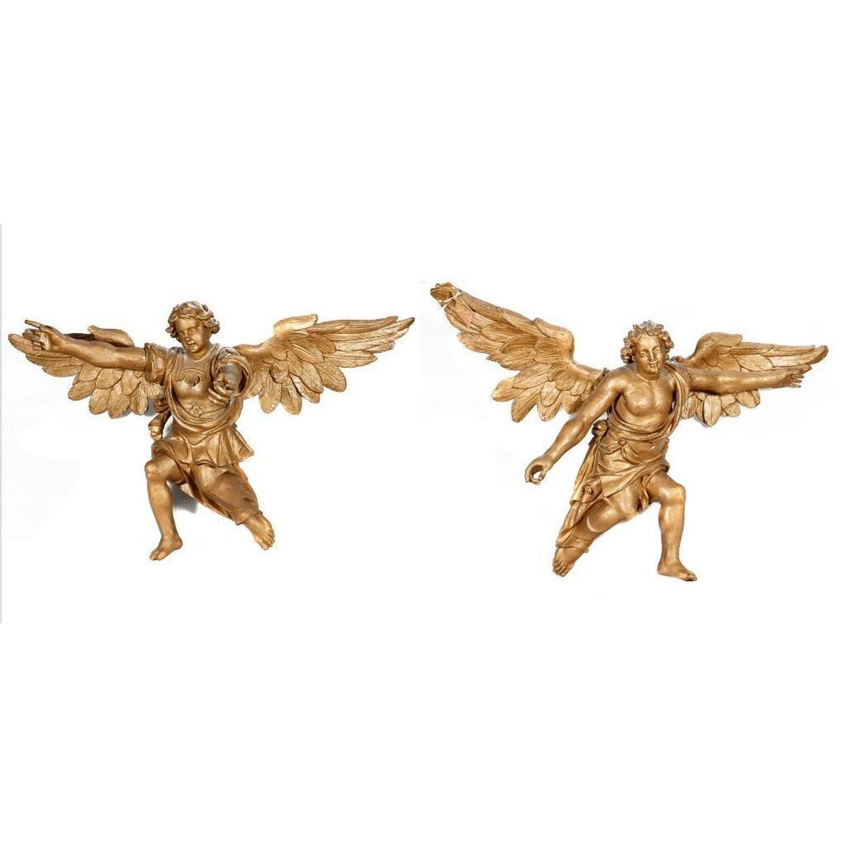 18th century, but gilding later. One angel with arms outstretched to the sides; the other with one arm reaching forward. 25in. h. 44in. w. 29in. h. x 42in. w. Condition: With chips, cracks, losses, and old repairs as expected with age; one wing with the tip/end broken off (but present). Note: Large lot for shipping.