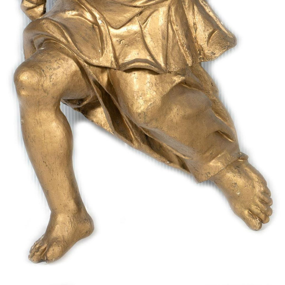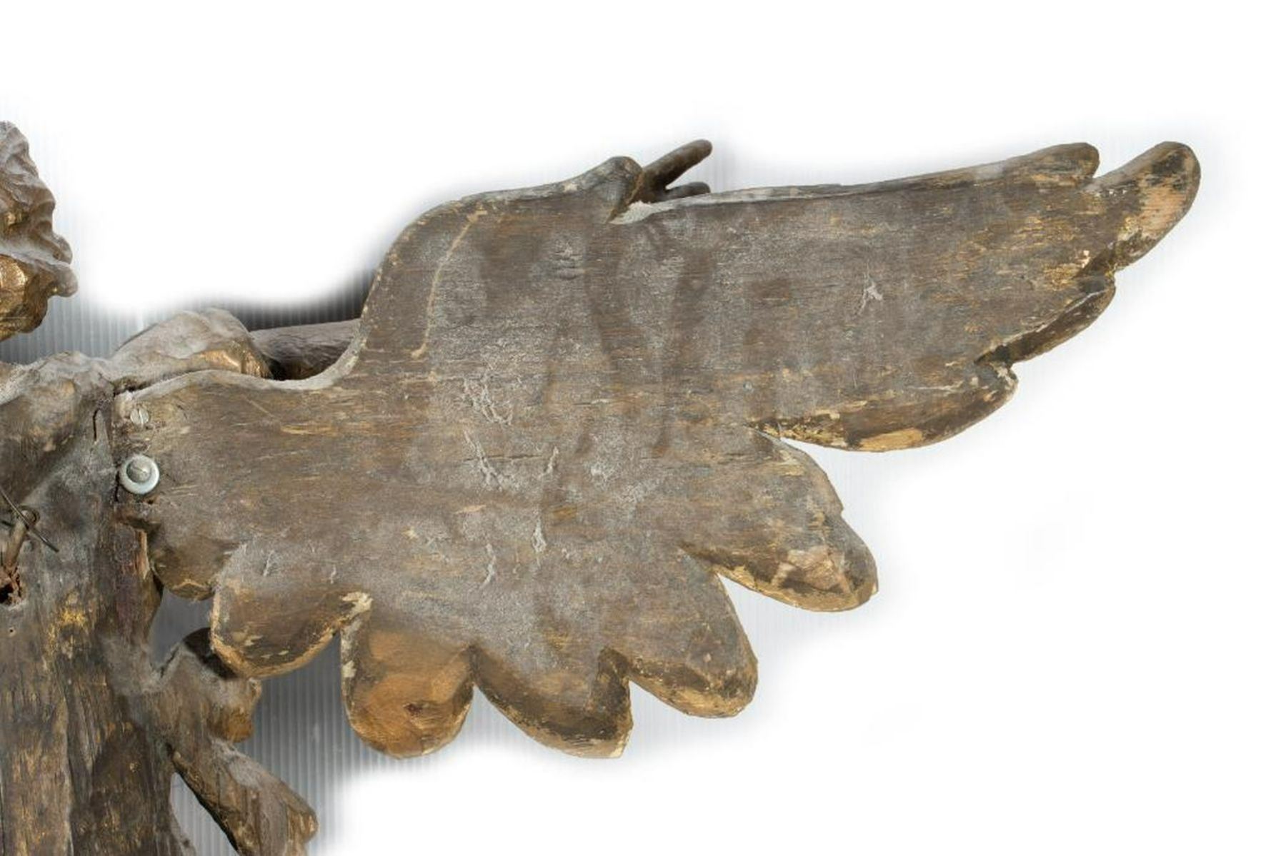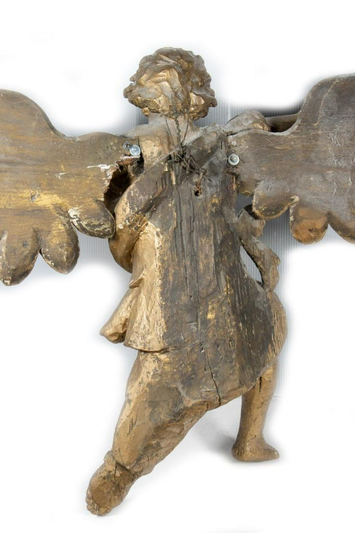 18th century, but gilding later. One angel with arms outstretched to the sides; the other with one arm reaching forward. 25in. h. 44in. w. 29in. h. x 42in. w. Condition: With chips, cracks, losses, and old repairs as expected with age; one wing with the tip/end broken off (but present). Note: Large lot for shipping.