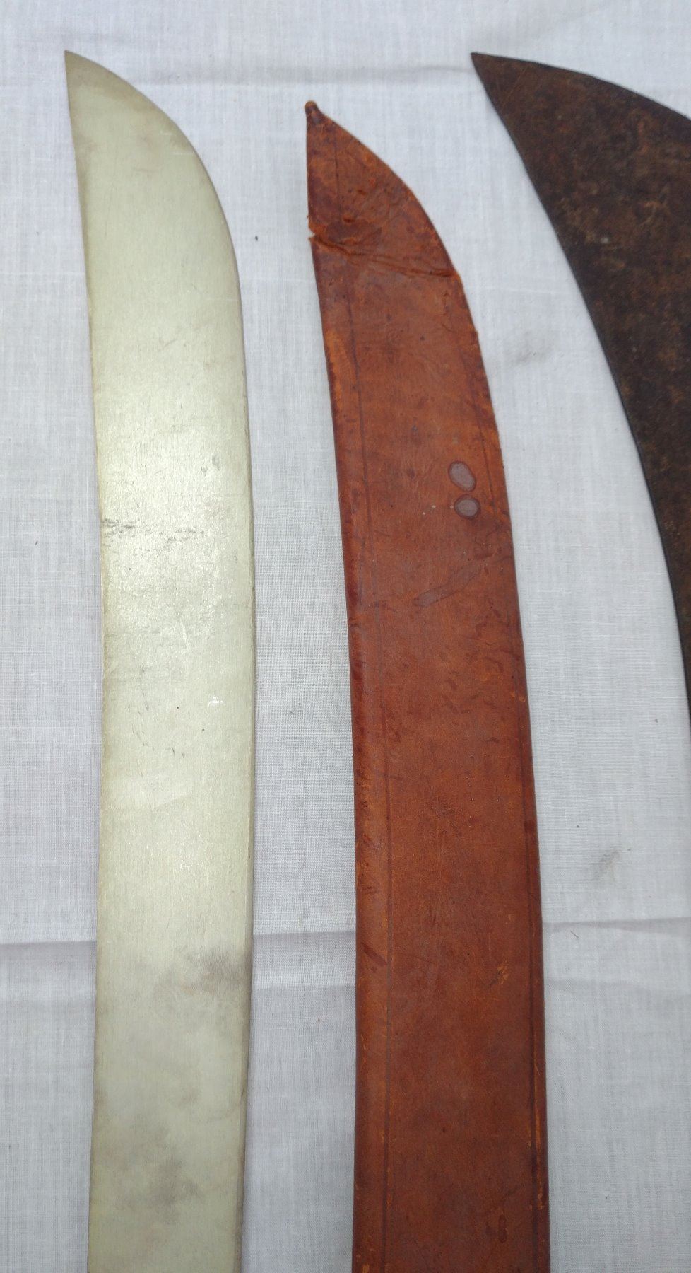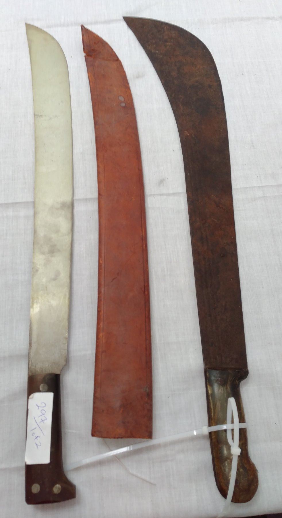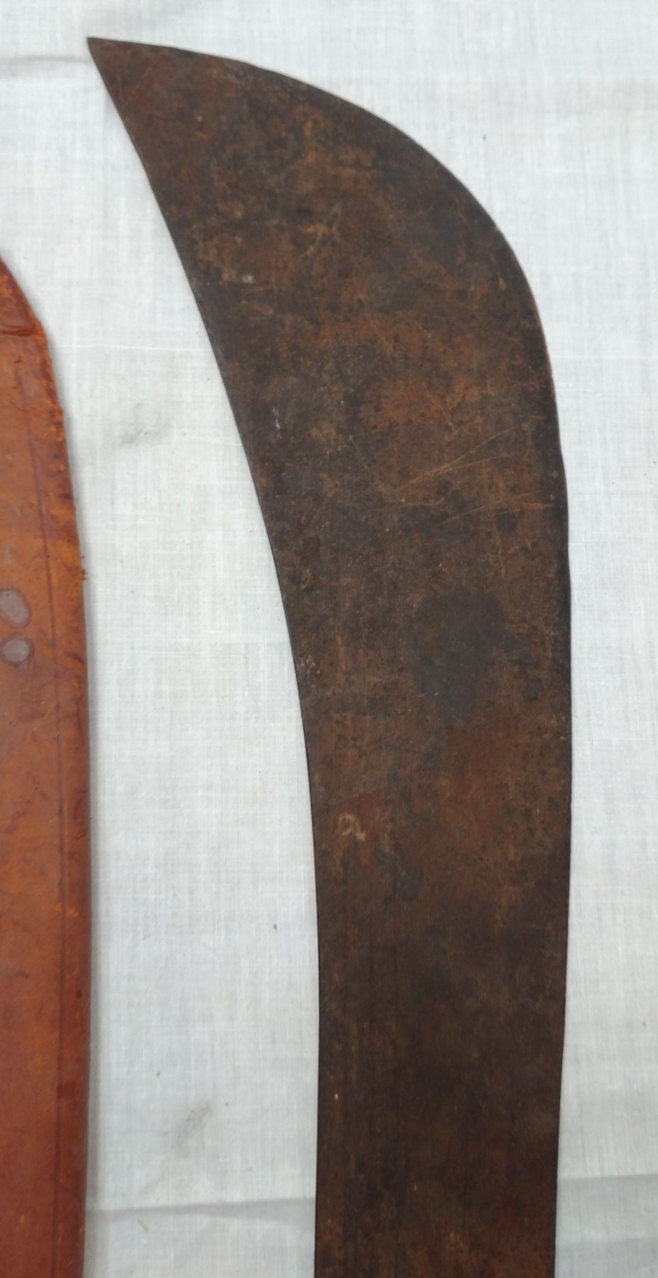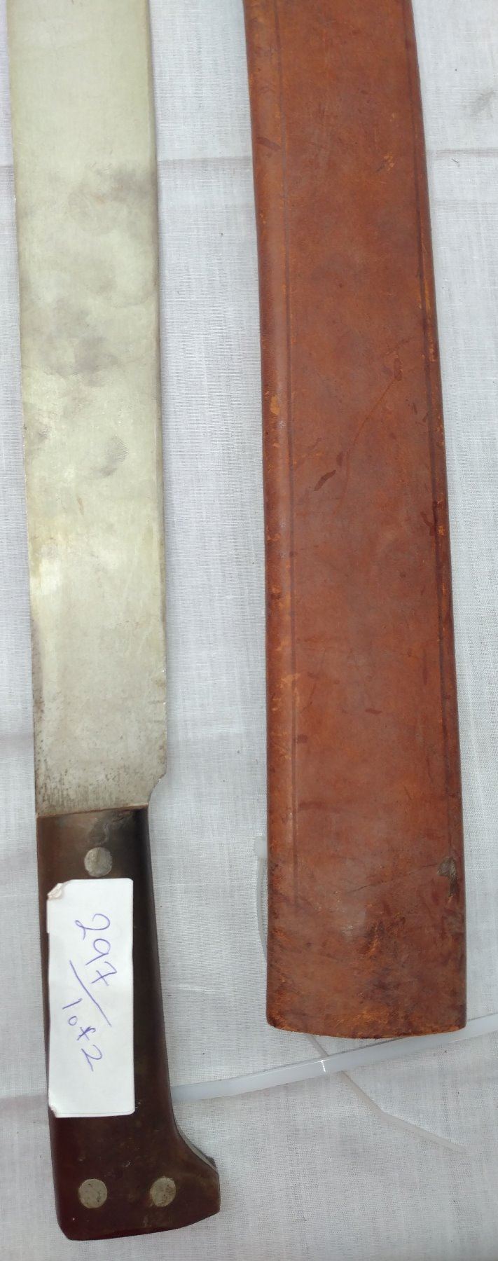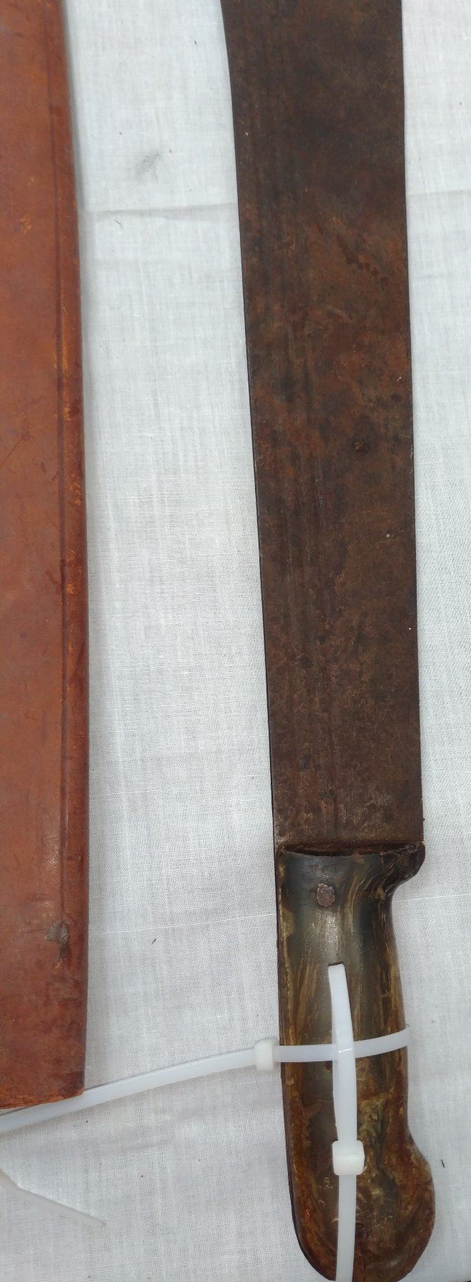 Pair of Large Machetes, c. 1940s. Made of steel, leather, horn and plastic, the items measure 27" x 5". Probably English and Spanish. Condition: Worn, some rust, see images. Shipping: $32.50 w/insurance and signature, due to length.