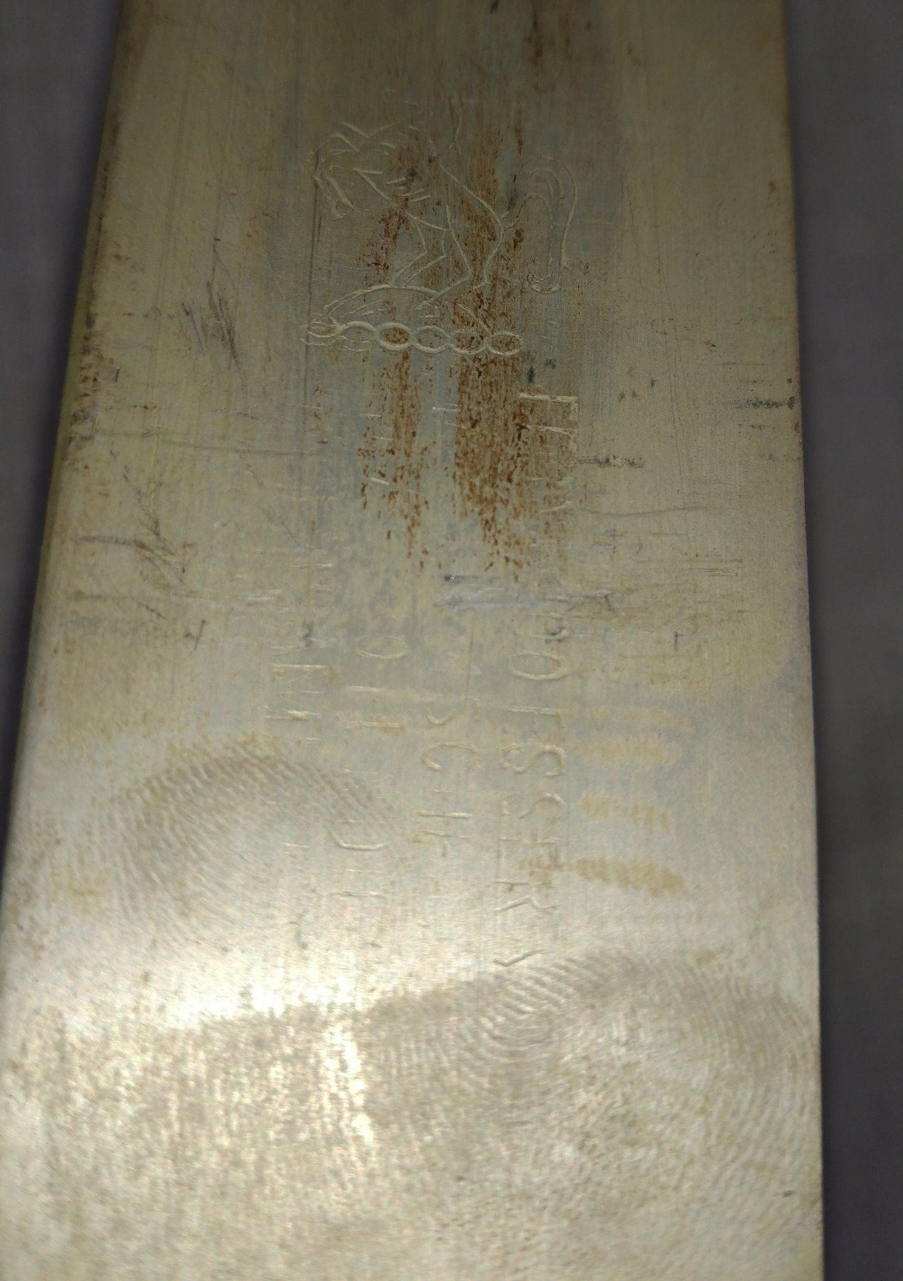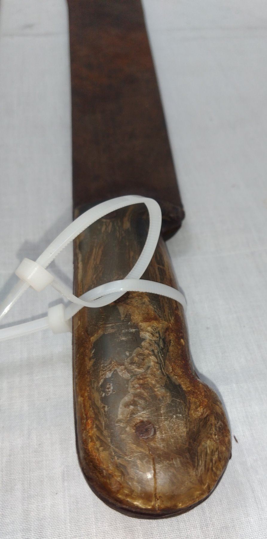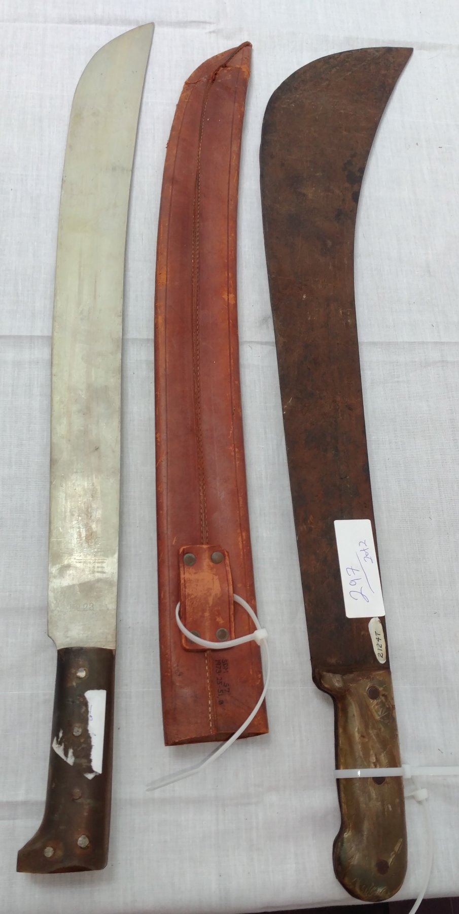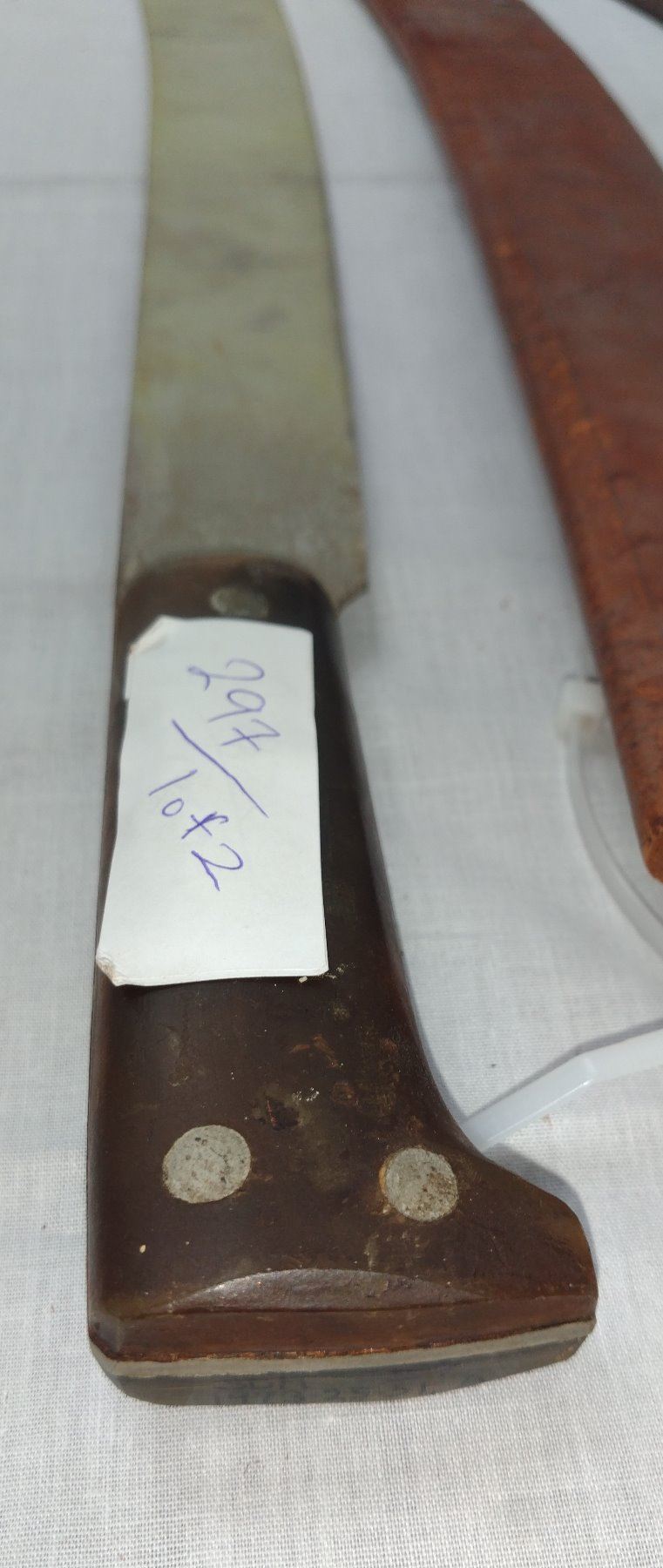 Pair of Large Machetes, c. 1940s. Made of steel, leather, horn and plastic, the items measure 27" x 5". Probably English and Spanish. Condition: Worn, some rust, see images. Shipping: $32.50 w/insurance and signature, due to length.