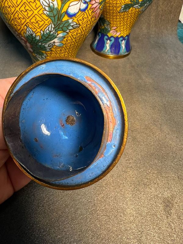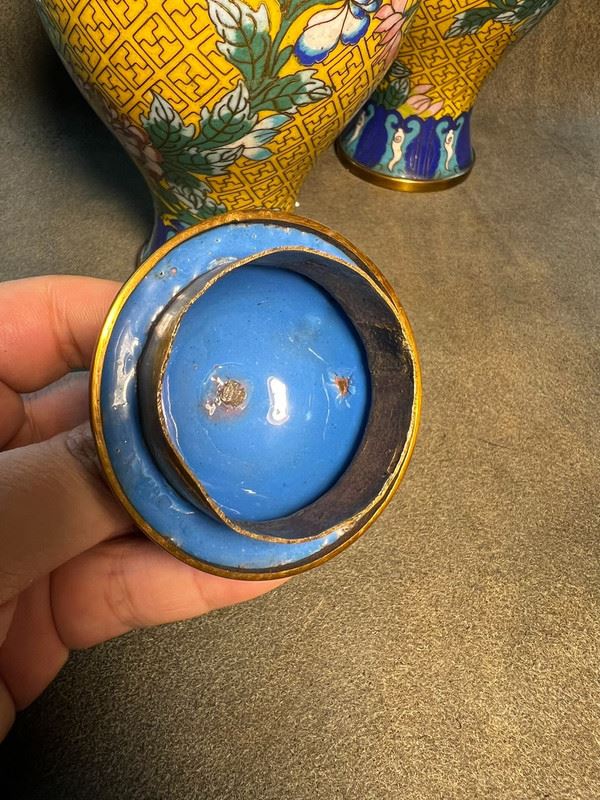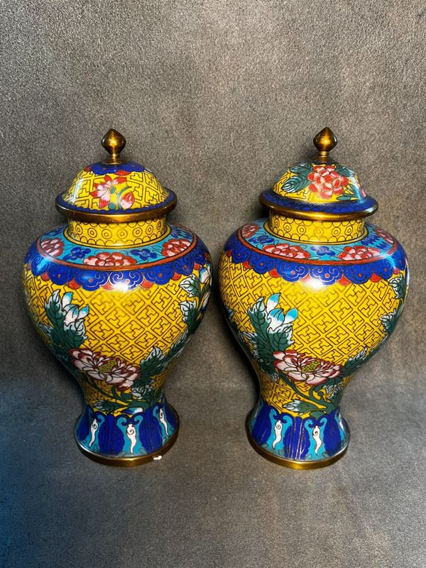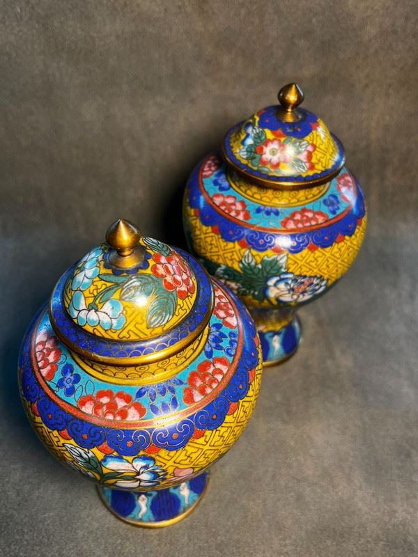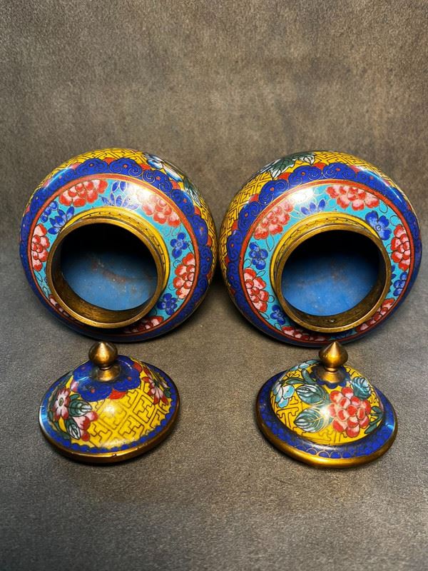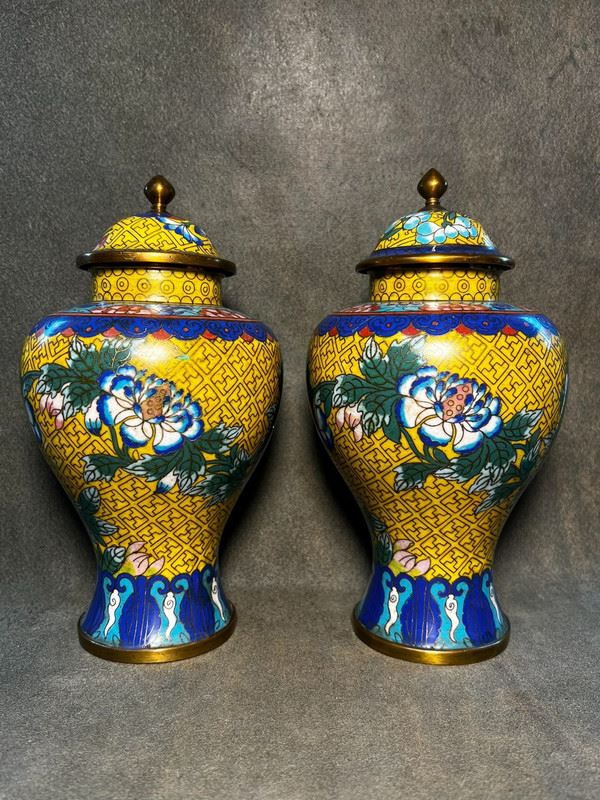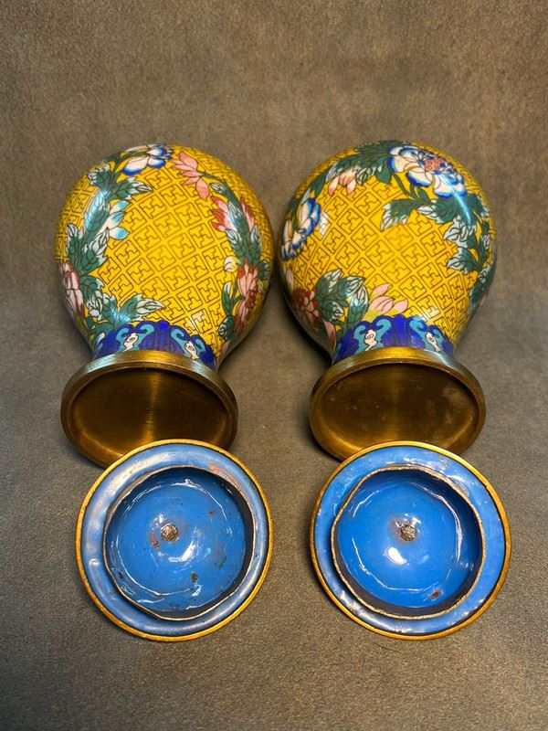 Dating to the Late Qing period, this pair of jars is crafted in cloisonné enamel on a copper body, featuring a bright yellow ground decorated with scrolling floral motifs. The blossoms and foliage are vividly colored, complemented by contrasting blue enamel bands around the rim and base. With their refined craftsmanship and elegant form, these jars exemplify the artistry of late Qing cloisonné and hold significant decorative and collectible value.
