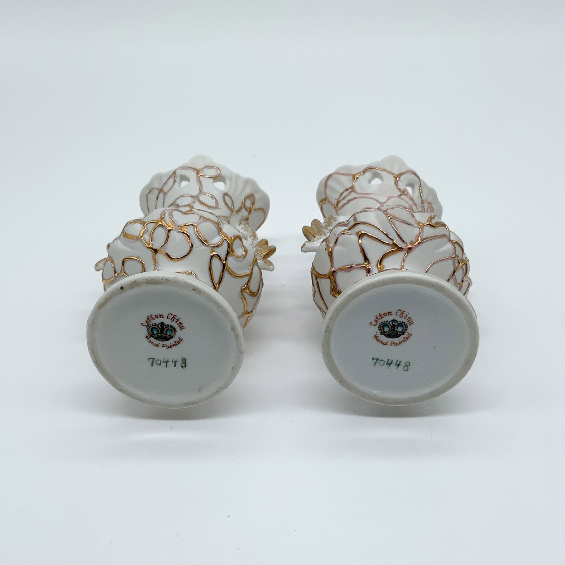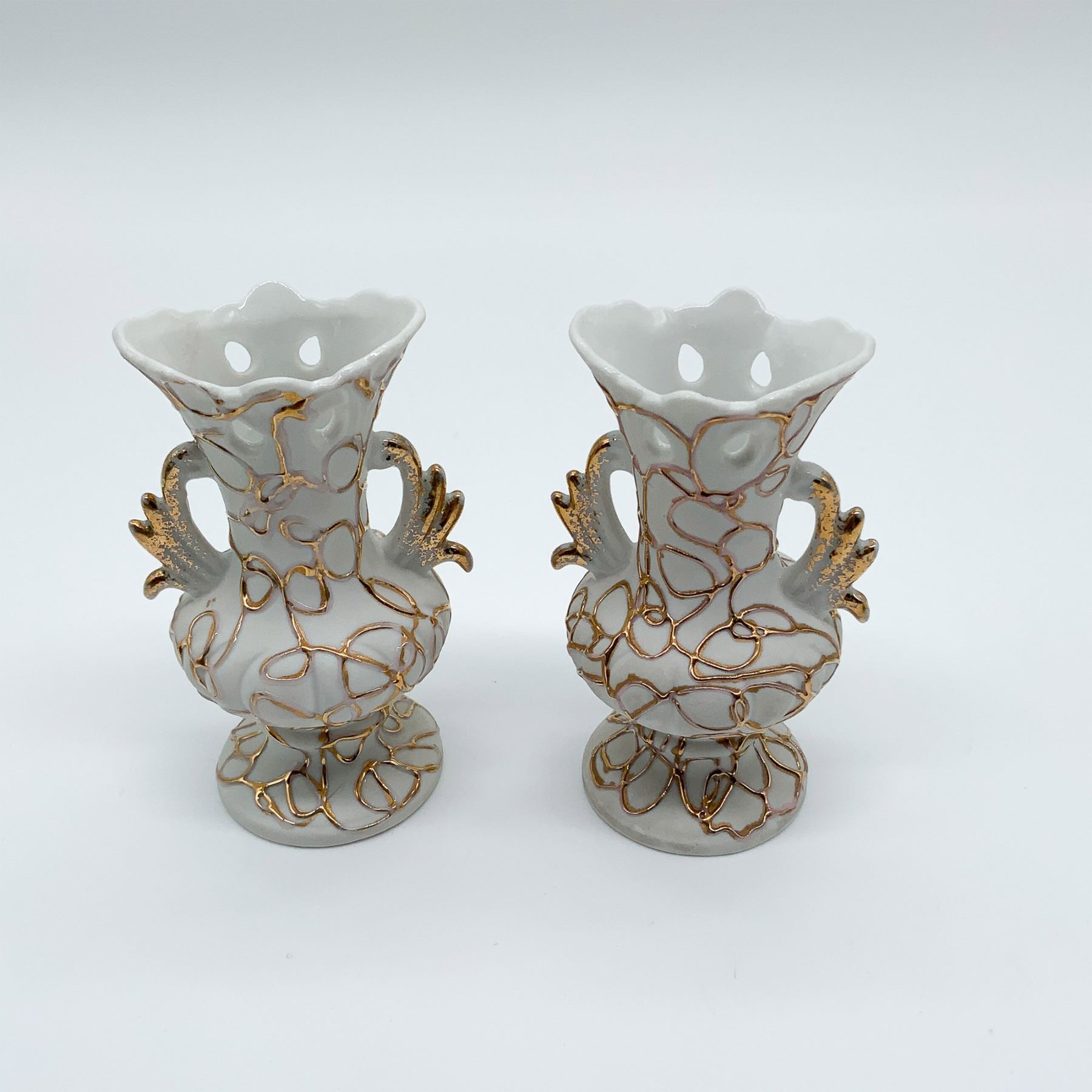 A charming pair of Lefton China handpainted porcelain vases featuring intricate gold gilt accents in a floral motif. These petite vases showcase scalloped rims with pierced details and delicately molded handles, adding an elegant touch to their design. Marked on the base with the Lefton China backstamp and numbered 70448, this pair highlights the craftsmanship and timeless appeal of Lefton artistry. Each vase measures 3.25 inches in height, making them ideal for display or as collectibles.
