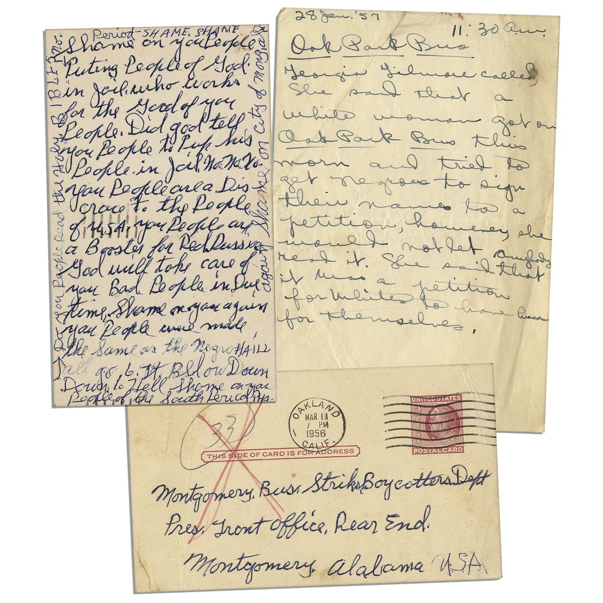 Two handwritten notes from 1956 and 1957, each commenting distinctly on the Montgomery Bus Boycott which changed the course of the Civil Rights Movement. First is a postcard from California with an 11 March 1956 postmark. Addressed to the ''Montgomery Bus Striks [sic] Boycotters Dept.,'' the unknown writer expresses disdain for the boycotters: ''Shame on you people putting people of God in jail who works for the good of you people. Did god tell you people to put his people in jail. No no no. you people are a disgrace to the people of USA. you people are a booster for Red Russia. God will take care of you bad people in due time. Shame on you again you people were made the same as the negro...all go 6 ft. below down down to hell shame on you people of the south period. Do you people read the Holy BIBLE? No. period shame, shame. again shame on city of mon[tgomery]. Al.'' The second is a 28 January 1857 note describing the desegregation after it took effect in December of 1956. Unidentified author writes, ''Georgia Gilmore called, she said that a white woman got on Oak Park Bus this morn and tried to get negroes to sign their names to a petition, however, she would not let anybody read it. She said that it was a petition for whites to have buses for themselves.'' Postcard measures 3.25'' x 5.5'' with minor toning. Second 1pp. note measures 4'' x 6'' with some toning and folds. Overall very good. From the collection of Maude Ballou, Martin Luther King Jr.'s close friend and personal secretary.