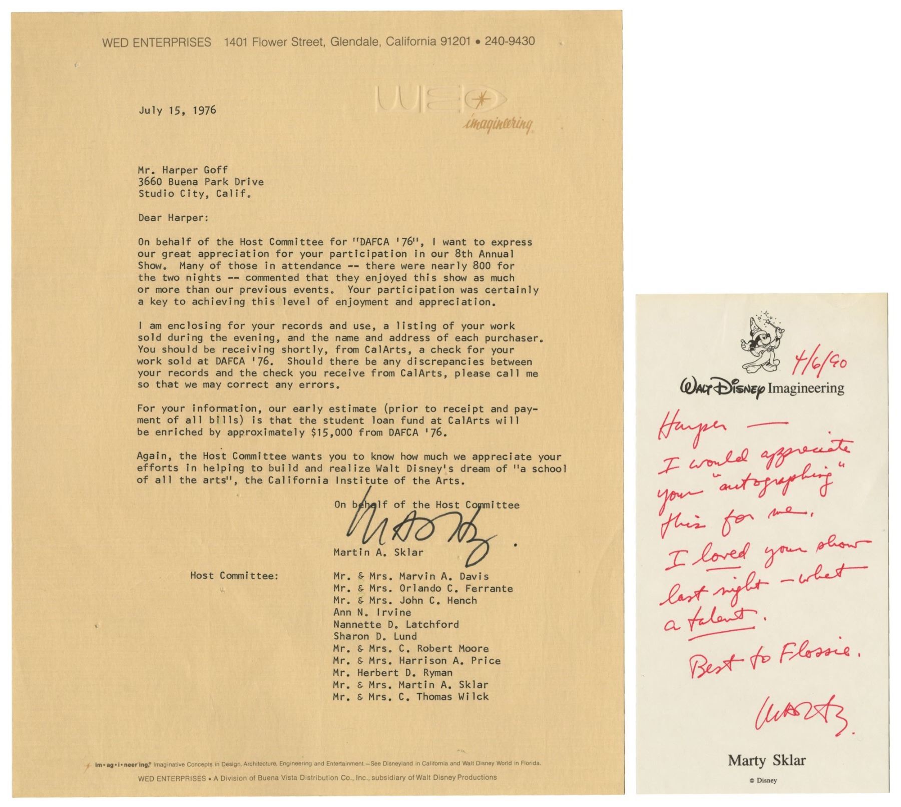 (Disneyland, 1976/90) A pair of personal letters sent from Marty Sklar to Harper Goff. The letters are on different sizes of Walt Disney Imagineering stationery and were written in July of 1976 and April of 1990. The letters feature a hand-written note by Sklar in red ink as well as one typed letter, and both are signed by Sklar. The letters measure 7"x3.5" and 11"x8.5", respectively. Both letters are in very good condition with fold lines to the larger letter from being mailed.