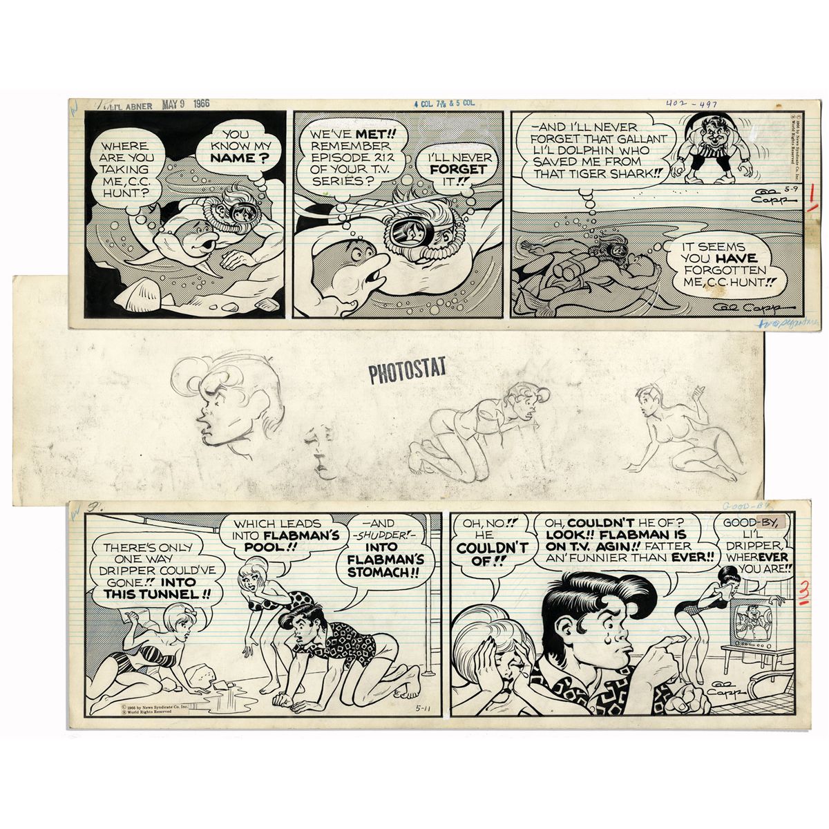 Pair of ''Li'l Abner'' Comic Strips Drawn & Signed by Al Capp From 9 & 11 May 1966 -- Featuring Li'l Abner & The Dolphin -- With Sketches to Verso -- 19.75'' x 6.25'' -- Toning, Near Fine