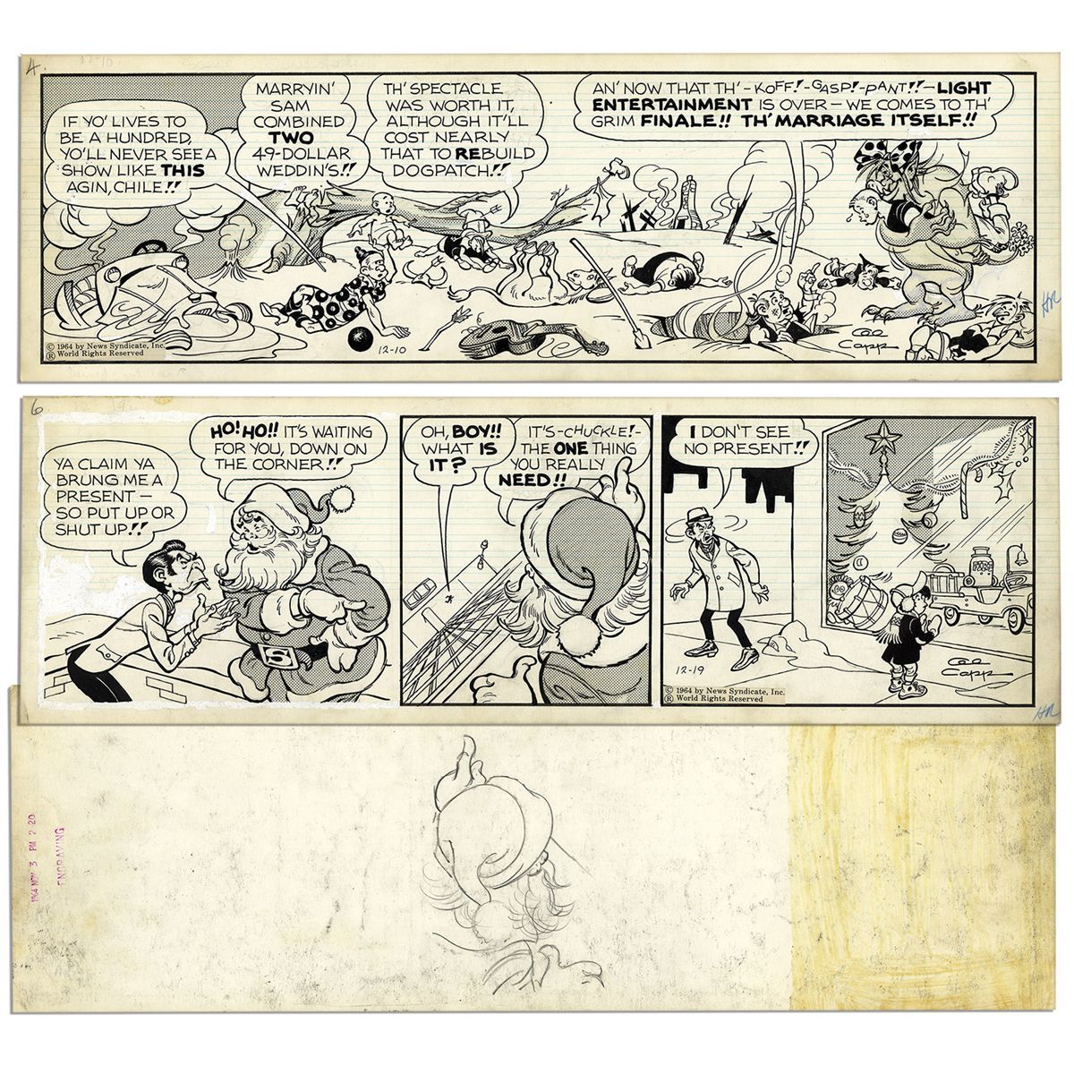 Pair of ''Li'l Abner'' Comic Strips From 19 December & 10 December 1964 Hand-Drawn & Signed by Al Capp -- Featuring Tiny Yokum & Santa Claus -- 19.75'' x 6.25'' -- Toning & White Out, Near Fine