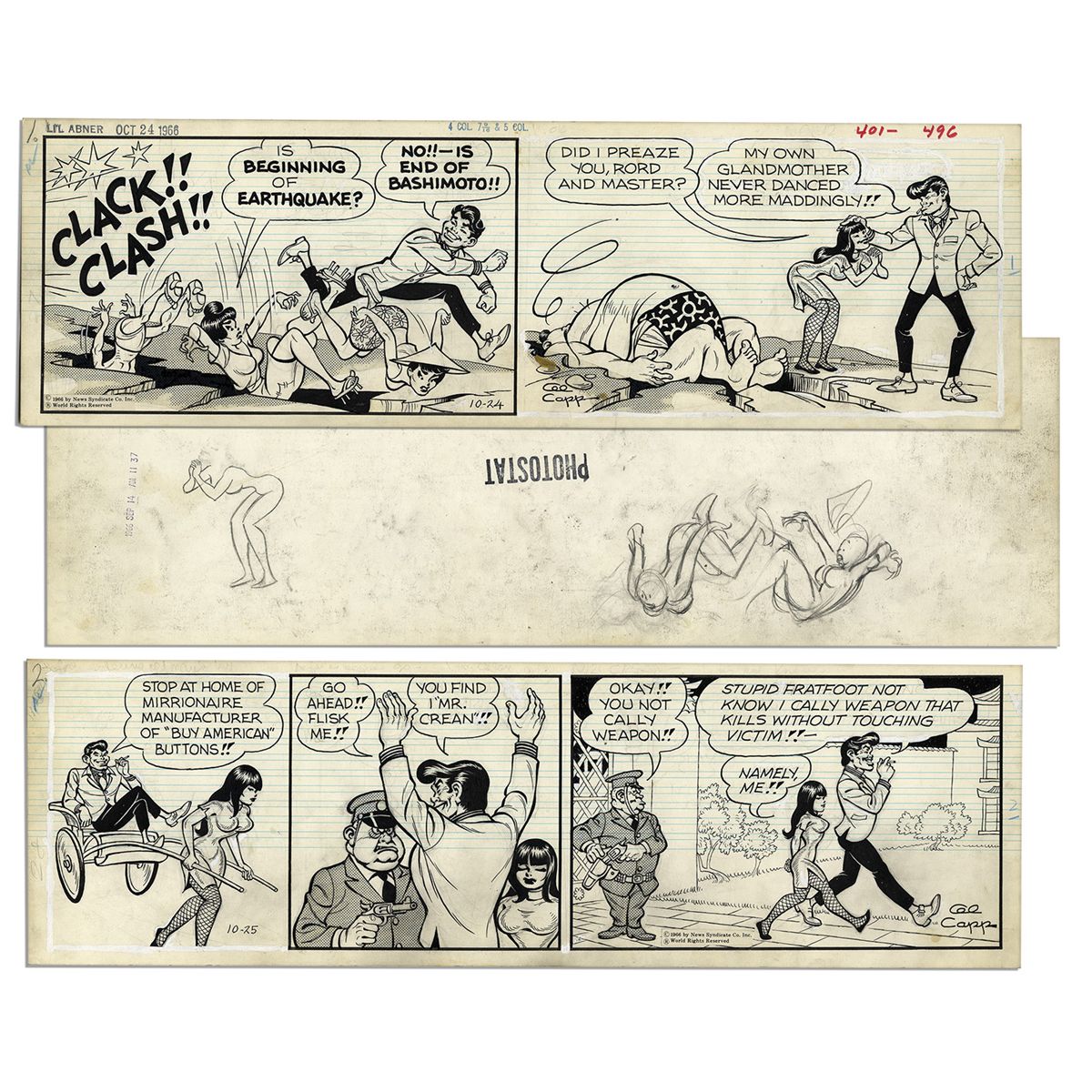 Pair of ''Li'l Abner'' Strips, Hand-Drawn & Signed by Al Capp From 24-25 October 1966 With Li'l Abner as Japanese Alter Ego ''Li'l Abnai Yokumoto'' -- 19.75'' x 6.25'' -- Near Fine