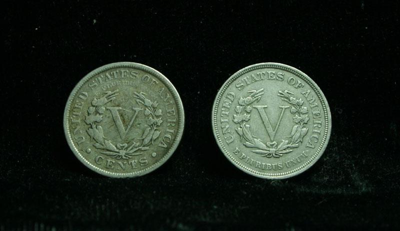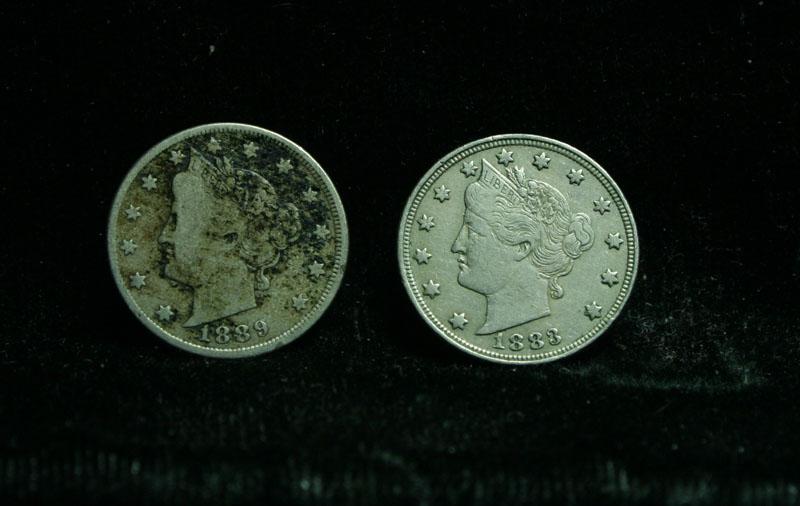 A pair of Nice 'V' Nickels. The 1883 No Cent grades XF and the 1889 grades VG. Estimated Value $25