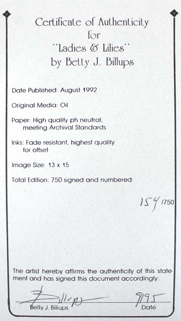 Pair of Limited Edition Signed & Numbered Prints, largest visual measures 13'' x 16'', total measurement of 15'' x 18'', can be rolled to ship, includes  1. Wild Flowers by Betty J. Billups, 1991, #142/750, comes with COA   2. Ladies &  Lilies by Betty J. Billups, 1992, #154/750, comes with COA