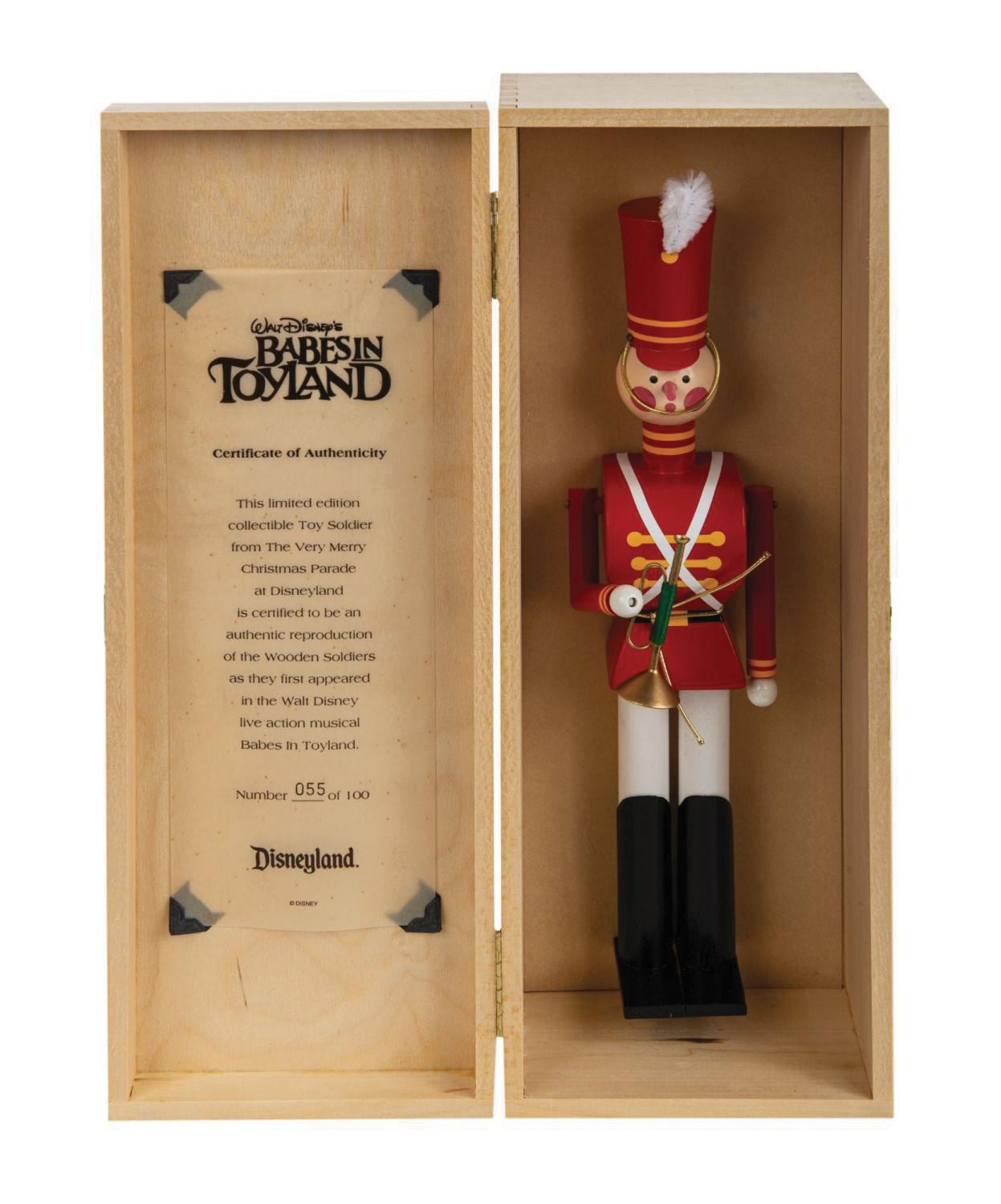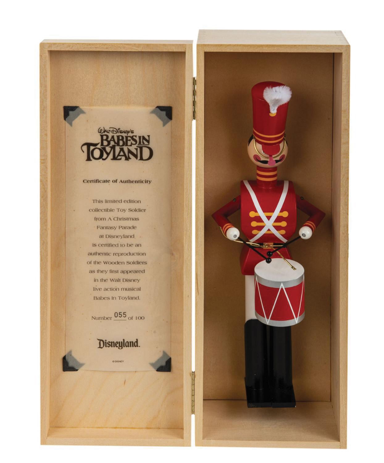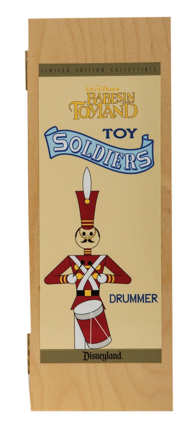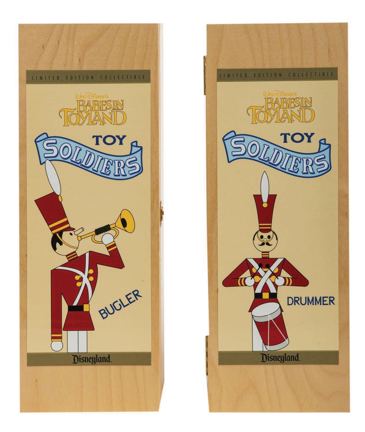 (Disneyland, 1999) A pair of limited edition collectible Toy Soldiers from The Very Merry Christmas Parade at Disneyland. These are authentic reproductions of the Wooden Soldiers as they first appeared in Walt Disney's Babes in Toyland, and were released at the first annual Disneyland Christmas Collectibles Festival, limited to 100 of each. Both the drummer and bugler figures measure 12.5" tall, in their 15"x5.5"x4" wooden box. These were special order items, and are in very fine unused condition. Each box contains a Certificate of Authenticity, with this matching set both numbered 055/100.