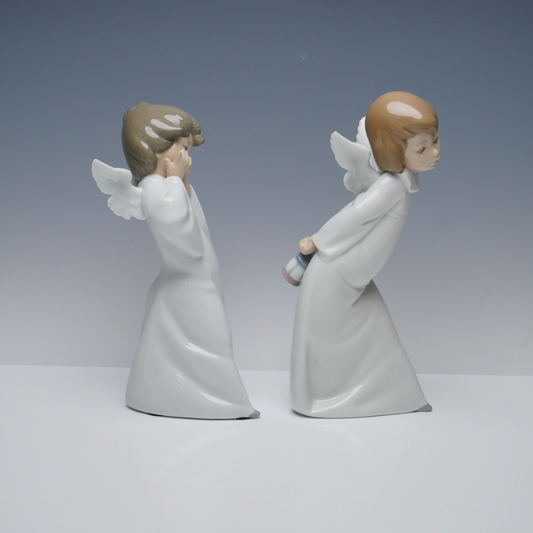 Pair of hand-painted porcelain cherub figurines. The pair depicts a cherub with hands held to the face in a puzzled expression (1004959), and a smiling cherub leaning forward while hiding a lantern behind their back (1004960). Both figures are finished in a glazed white robe with delicate wings and pastel-toned features. Each marked to the underside with blue Lladro backstamp. Cherub Puzzled: 6"L x 4.25"W x 9"H. Cherub Smiling: 4.75"L x 2.75"W x 9.25"H
