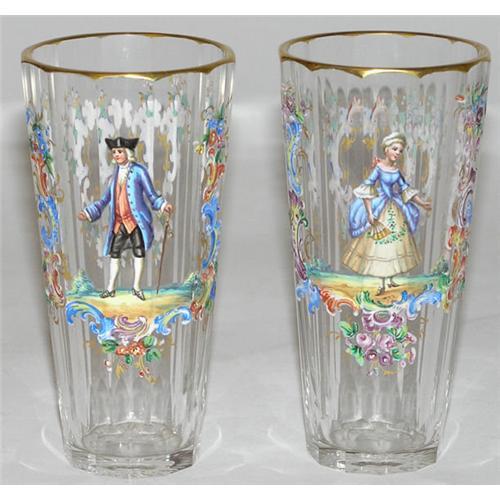 This pair of gilded and enamel painted tumblers is attributed to Lobmeyer (Lobemeyer, Lobmeyr Lobemeyr). Each measures 4.25" high and 2" across. Each is in excellent condition with no chips or cracks. They feature a gentleman and lady in eighteenth or early nineteenth century attire, with rear panels decorated with flowers and interlocking c-scrolls. These items come from an impressive collection of antique Bohemian and French glass numbering over 150 items. They reside with our client on the Upper East Side of Manhattan in New York city, and may be seen by appointment.