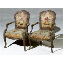 Pair of Louis XV Style Beechwood Needlepoint Tapestry Upholstered Fauteuils