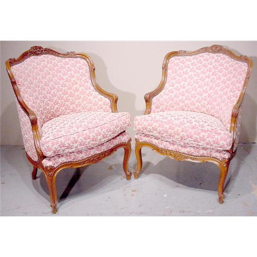 <table width="100%" border="0" cellspacing="0" cellpadding="4"><tr><td><em> </em></td></tr><tr> <td width="100%"> Pair of Carved Walnut Louis XV Style Bergeres. Circa 1880. </td></tr><tr> <td> </td></tr><tr> <td>Reference #: E089</td></tr><tr><td>Condition:Good</td></tr><tr><td>Year:Circa 1880</td></tr><tr><td>Country:France</td></tr><tr><td>Height:37</td></tr><tr><td>Depth:23</td></tr><tr><td>Width:27</td></tr><tr><td>Title:Pair of Louis XV Style Bergeres</td></tr><tr><td>Style:Louis XV</td></tr><tr><td>Materials:Walnut</td></tr><tr><td>Location:Atlanta, GA</td></tr></table>