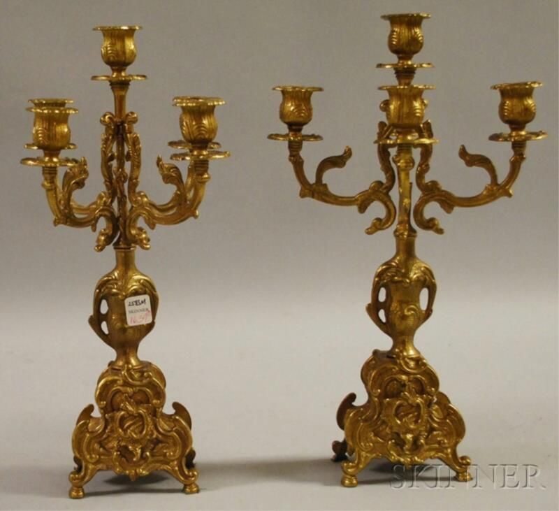 Pair of Louis XV-style Cast Brass Five-light Candelabra, ht. 16 1/4 in.