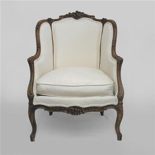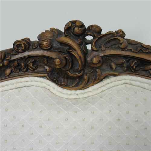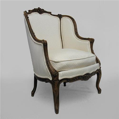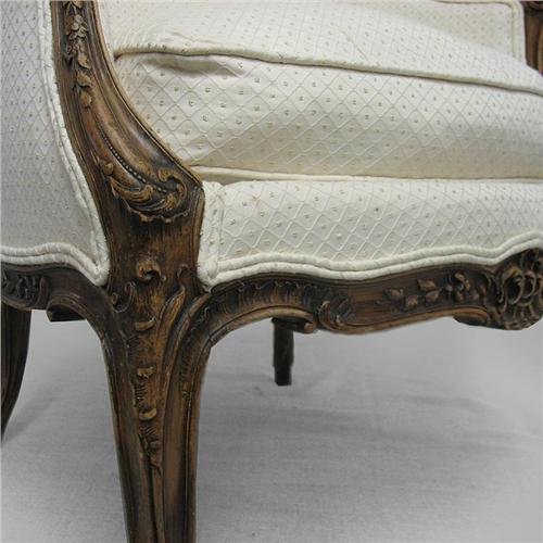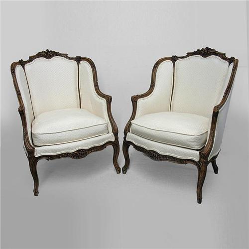 Pair of Louis XV style walnut bergere chairs; carved and pierced crest rail with floral and raffle decoration; carved frame and apron; cabriole legs; late 19th to early 20th C.; 39" high x 28" across x 21" deep; no visible defects