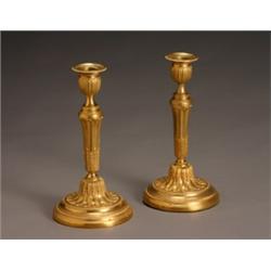 Pair of Louis XVI Style Ormolu Candlesticks, First Quarter 20th Century, One with losses to r...
