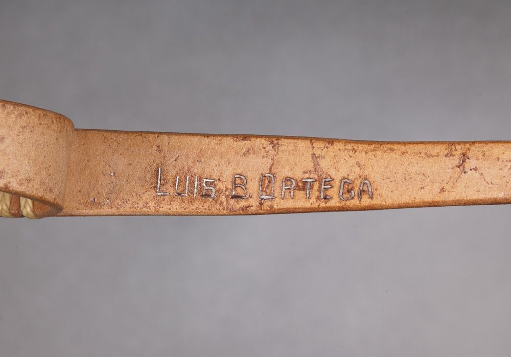 Each measuring 1/2” wide and 46” including the leather popper, both have the name LUIS B. ORTEGA carved into the leather popper. The fancier one has natural buttons with red and brown accents and a fancy crisscross on the popper, the other has natural and tea stained buttons.
