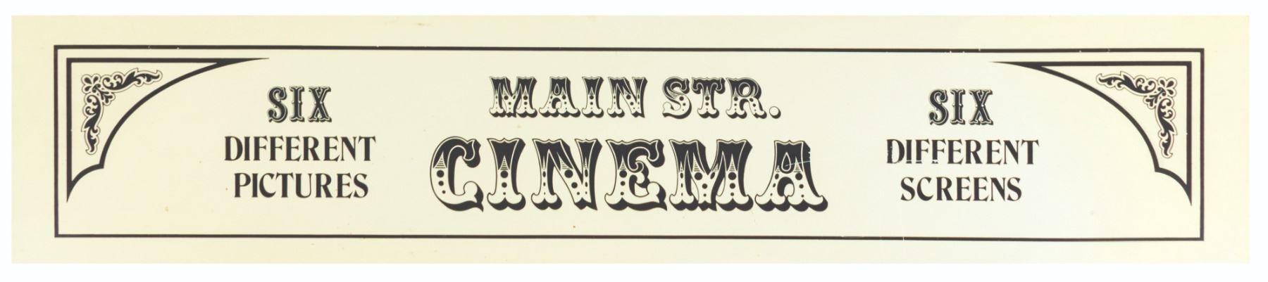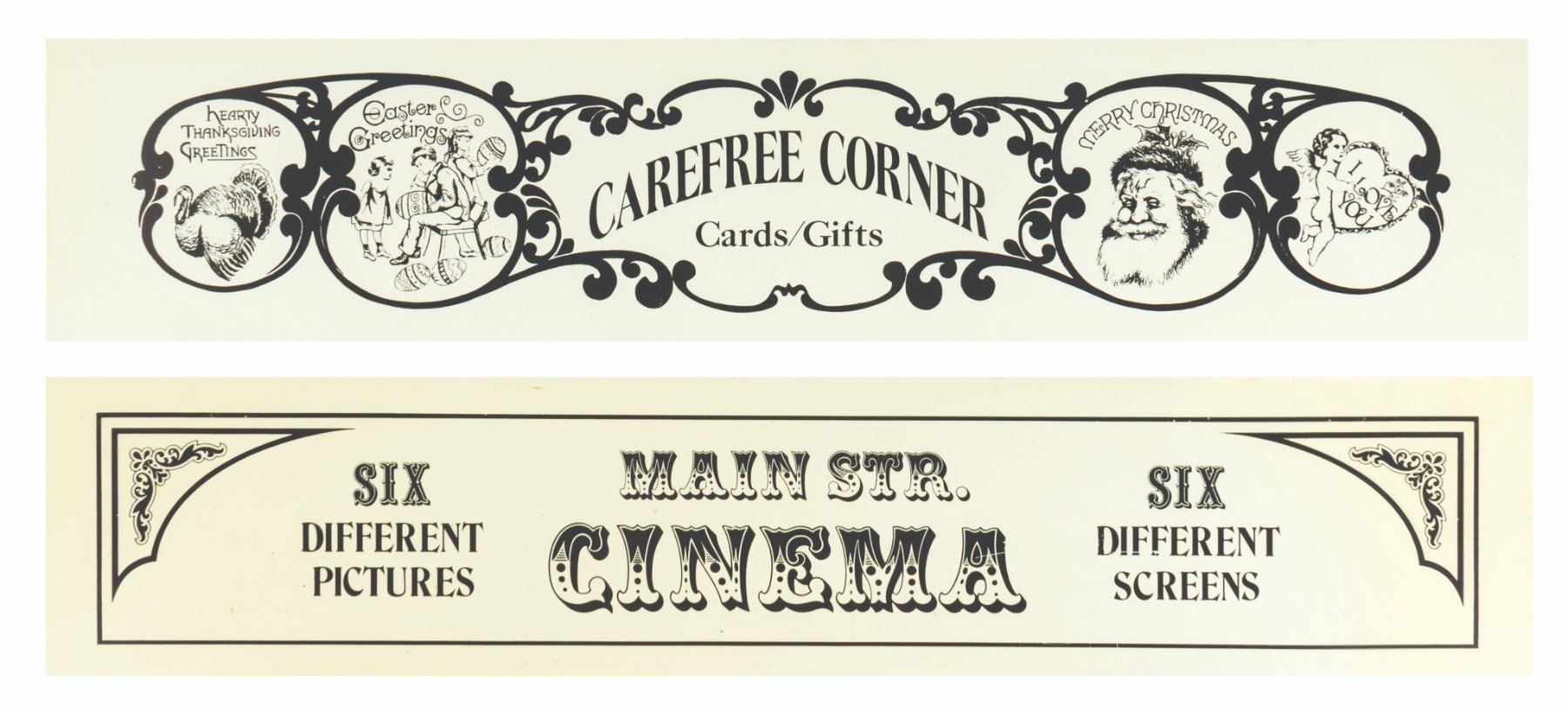 (Disneyland, c.1980s) A pair of original signs used within the iconic Main Street trolley. These old-timey signs advertised for other Disneyland attractions, with these two promoting the Main Street Cinema and Carefree Corner. Created in acrylic board, the signs measure 6.25"x30" and are in good condition overall with surface scratches and scuffs from use. The signs have Velcro tabs on the reverse from previous display.
