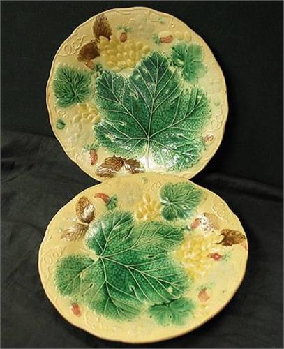 Pair of Majolica grape leaf plates they measure 9 1/4" across. Both plates are crazed and have cracks that are difficult to see