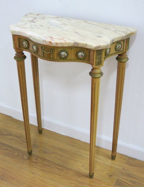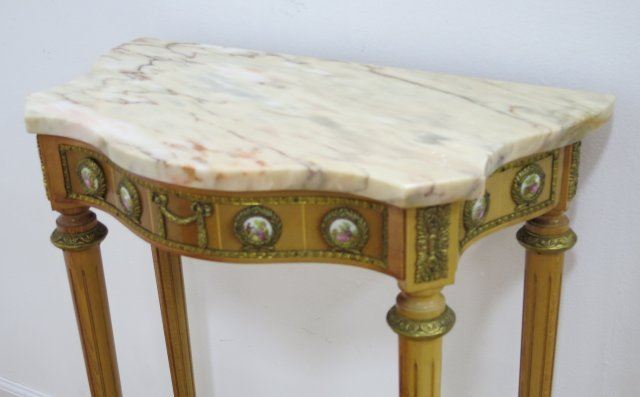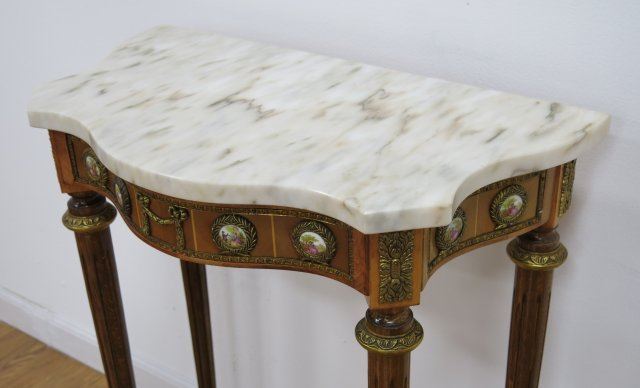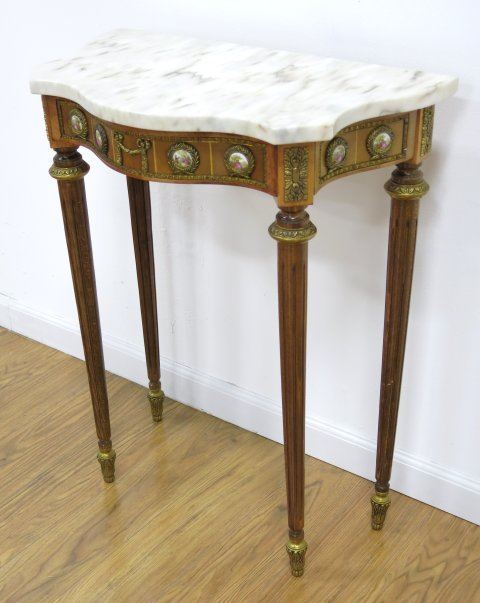 Mid-century serpentine front with porcelain plaques & brass mounts. Approx. 31" H x 23" W x 12 3/4" D.